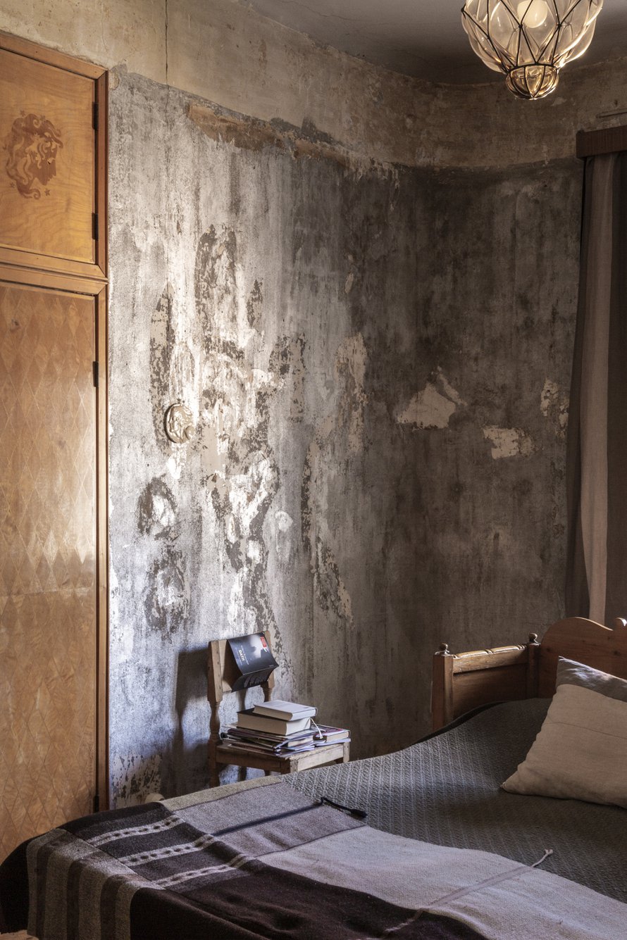 Makuuhuoneen seinien patinoitunut pinta tuli näkyviin, kun vesivahingon pilaamat tapetit poistettiin. "Kun näimme pinnan tällaisena, emme halunneet enää piilottaa sitä. Jätimme sen näkyviin kertomaan asunnon vaiheista."