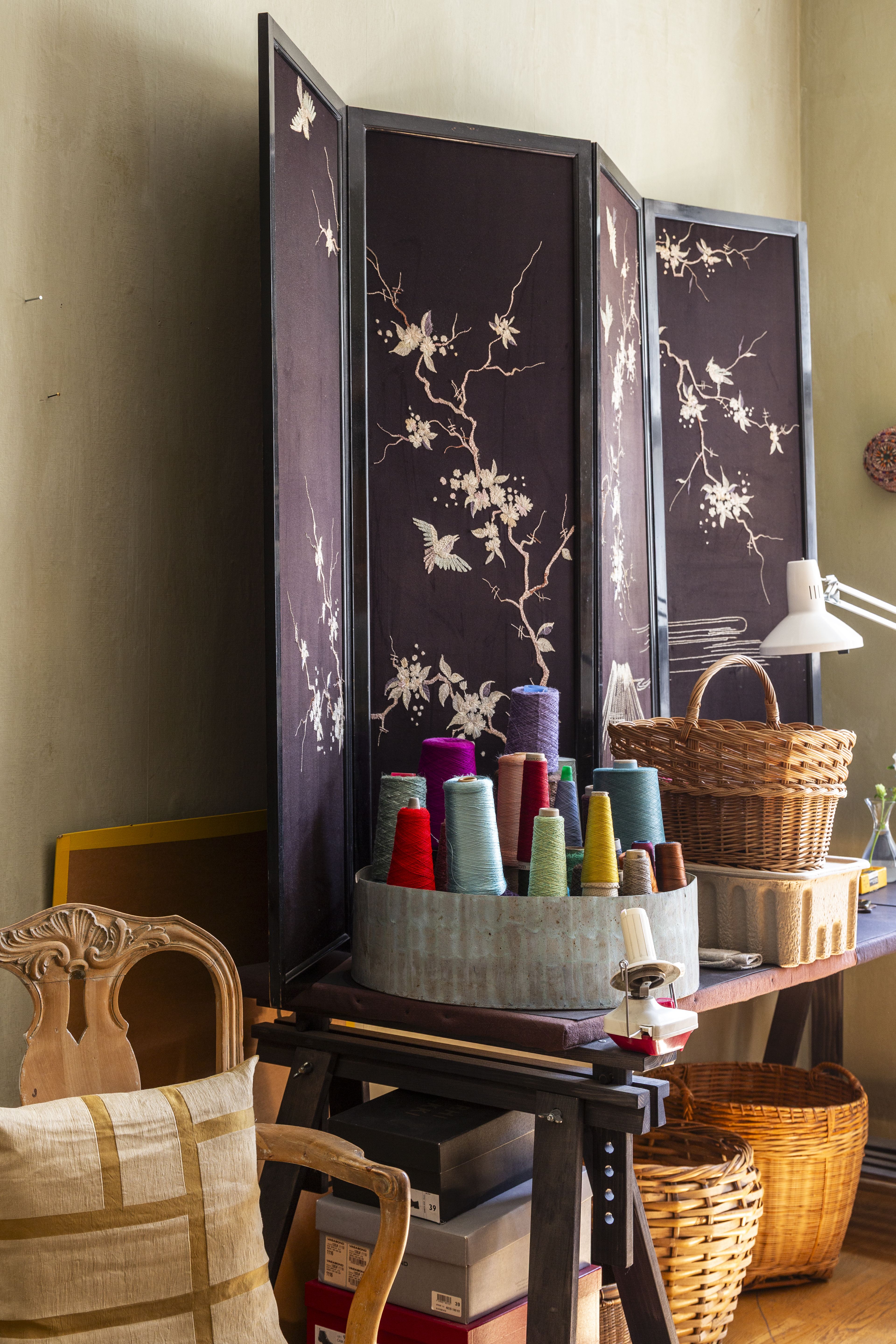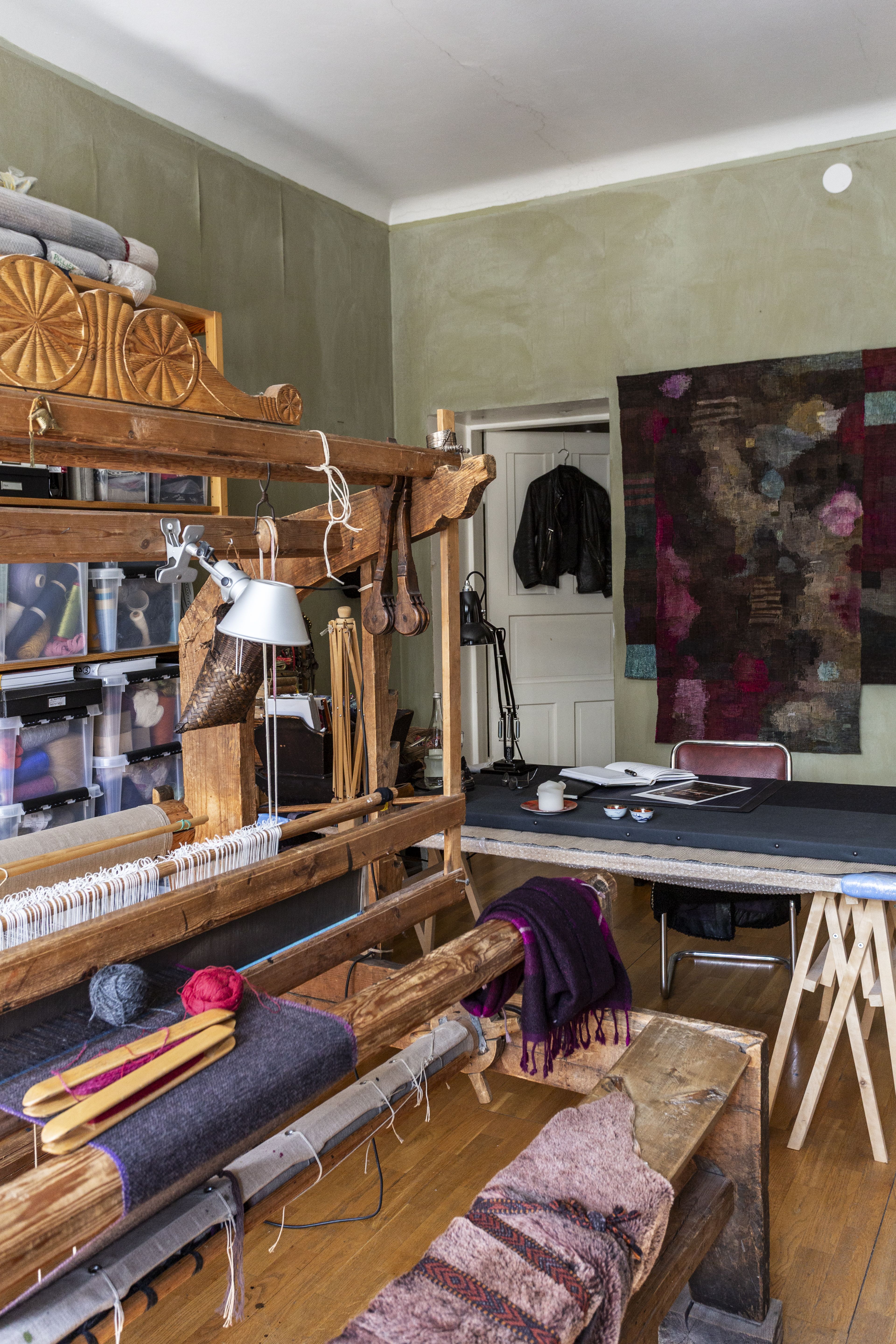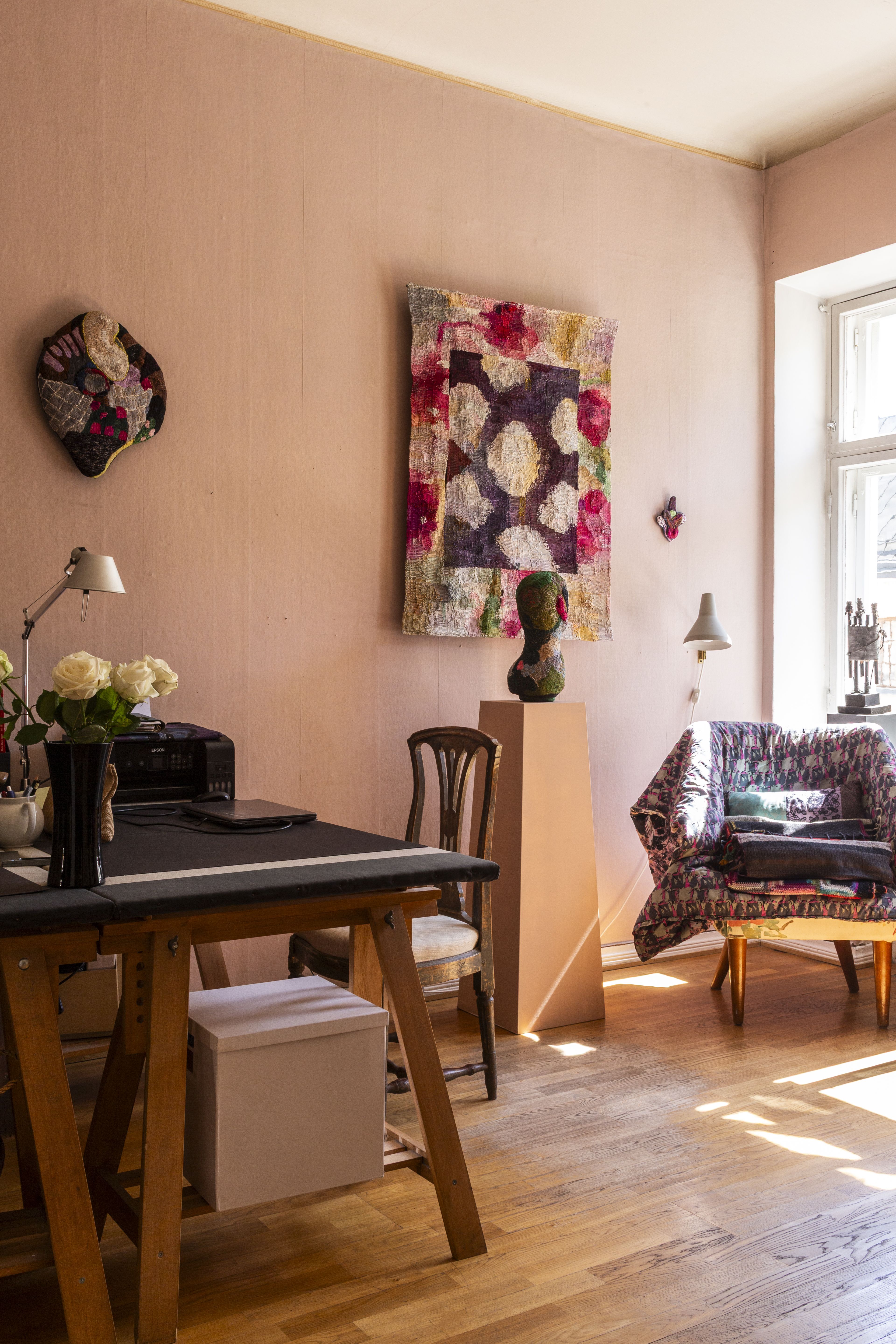 Ilman työtäni meillä näyttäisi aivan toiselta - ja toisin päin, ilman tätä asuntoa teokseni olisivat todennäköisesti toisenlaisia. Työskentelen kotona, ja tässä asunnossa suuret ikiaikaiset pyöröspuut mahtuvat työhuoneeseeni, joten voin kutoa isoja seinägobeliineja. Jos asuisin yksiössä, työskentelisin luultavasti keittiön pöydän ääressä ja tekisin pieniä teoksia.
