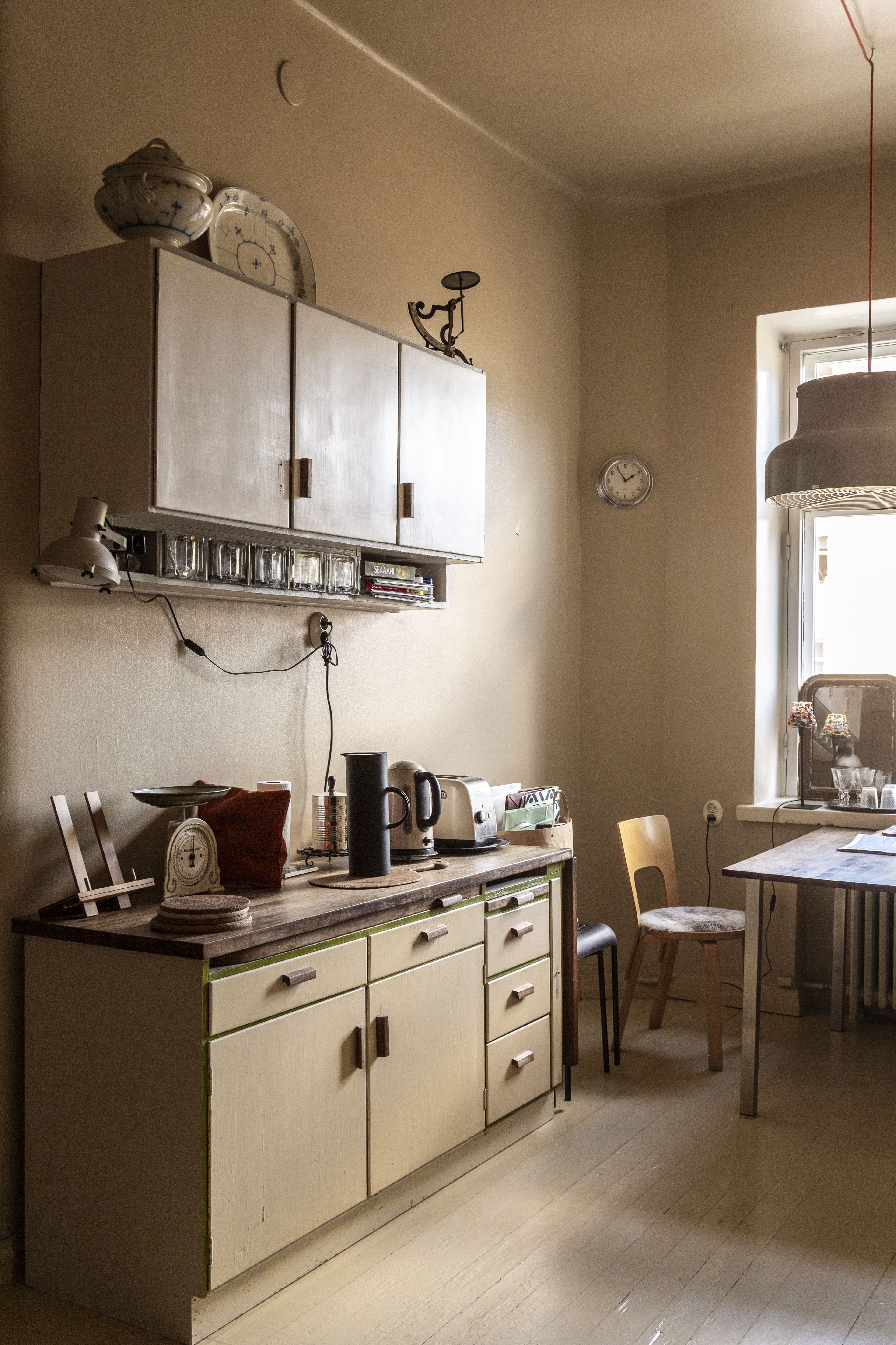 Vuonna 1912 valmistuneessa asunnossamme on säilynyt paljon rakennusaikaisia elementtejä. Keittiön kaapistoistakin suurin osa on alkuperäisiä, yli 110-vuotiaita, eikä niiden ole tarkoituskaan näyttää pakasta vedetyiltä. Toisaalta keittiön uusi terästasokin oli viikon käytön jälkeen jo naarmuilla. Esineet ja kodin pinnat kuluvat ja haaltuvat, mutta se kuuluu asiaan. Minulle patina on ennen kaikkea huomio ajan kulumisesta.