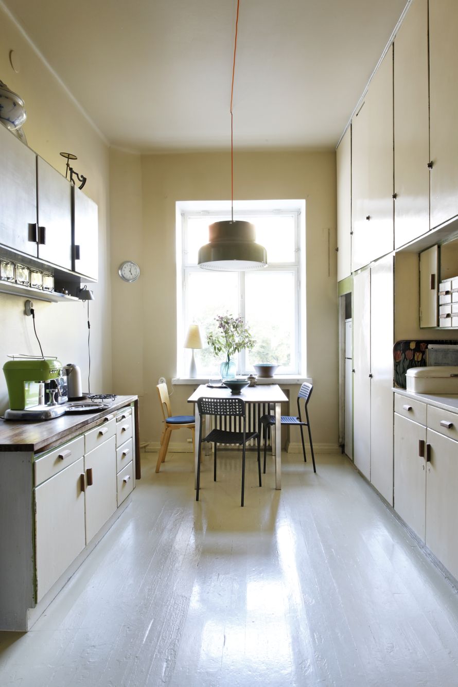 Keittiö on yhä alkuperäisessä asussaan. Seinät, katto ja lattia maalattiin kaikki samalla kellertävällä sävyllä kuin kaapit, jotta tunnelmasta tuli harmoninen ja mittasuhteet hämärtyvät. Ainoat uudet hankinnat asuntoon ovat Ateljé Lyktanin Bumling-riippuvalaisin sekä Ikean mustat pikkutuolit.