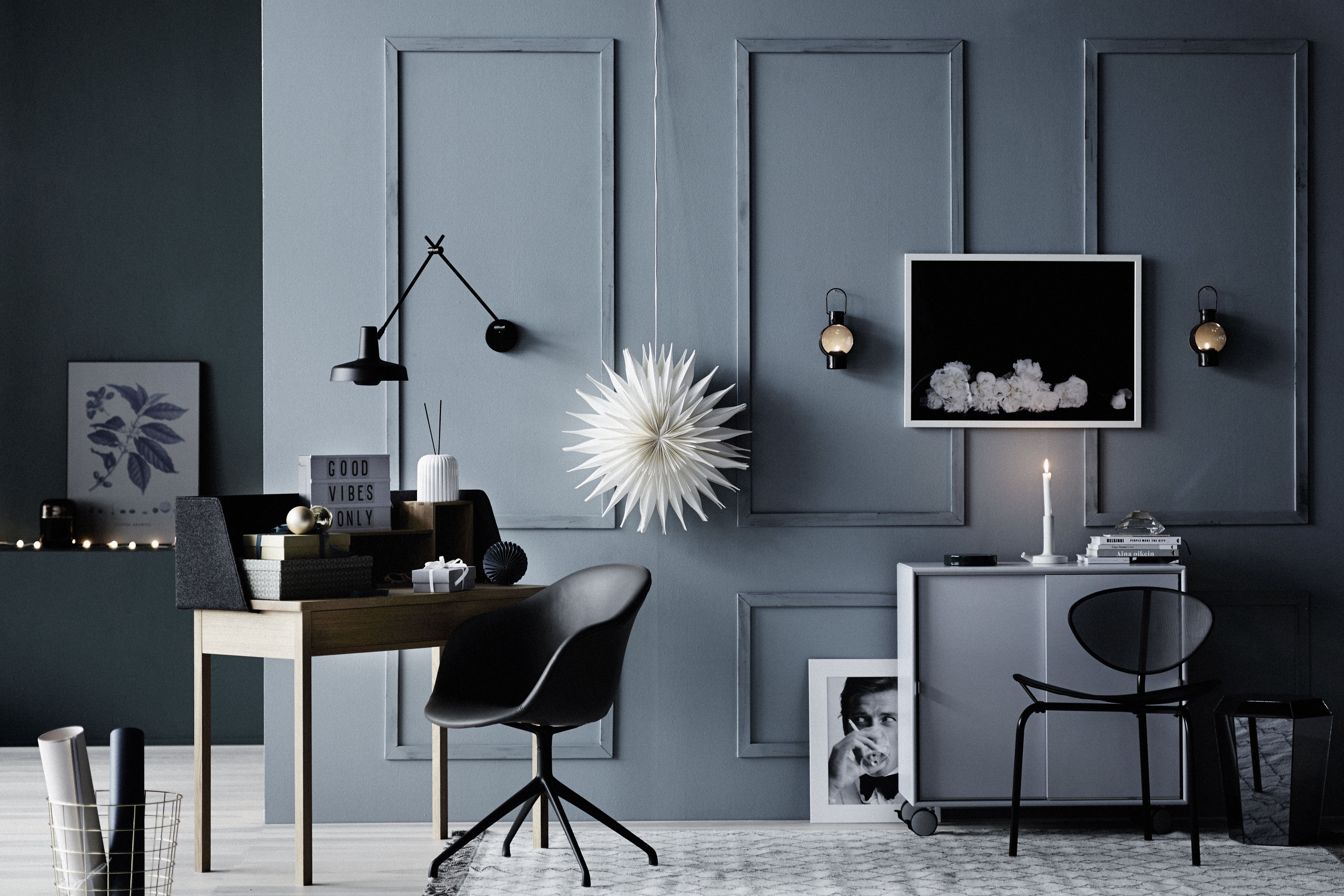 Työpöydällä oleva sininen kuviollinen laatikko 22 e, ja tumma paperipallo 10 e, Olkkari. Beige ja harmaa laatikko ovat kuvausrekvisiittaa. Kultaiset joulupallot 12,99 e / 54 kpl, Clas Ohlson. Lightbox-kirjainvalo 39 e ja adapteri 8,90 e, Putinki. Valkea-alustaiset Cache Cache -huonetuoksutikut 83 e, Kartell. Vaaleansininen liukuovikaappi on Montanan uutuus, hintatiedustelut Vepsäläinen. Kaapinpäällä oleva Hayn Bits n' Bobs -rasia 14 e, Armas Design, ja Seraxin valkoinen kynttilänjalka 19 e, Olkkari. Timanttinen Facet-veistos sopii paperipainoksi, 46 e, Bo Concept. Image Republicin Bond-juliste 62 e ja Gubin ilmava Matégot-tuoli 465 e, Armas Design. Diamond-sivupöytä 269 e, Bo Concept. Lattia on Tarketin Prestige Saarni Seashell -lankkuparkettia, joka on käsitelty antiikkiharjausmenetelmällä, 92 e/m², tarkett.fi.