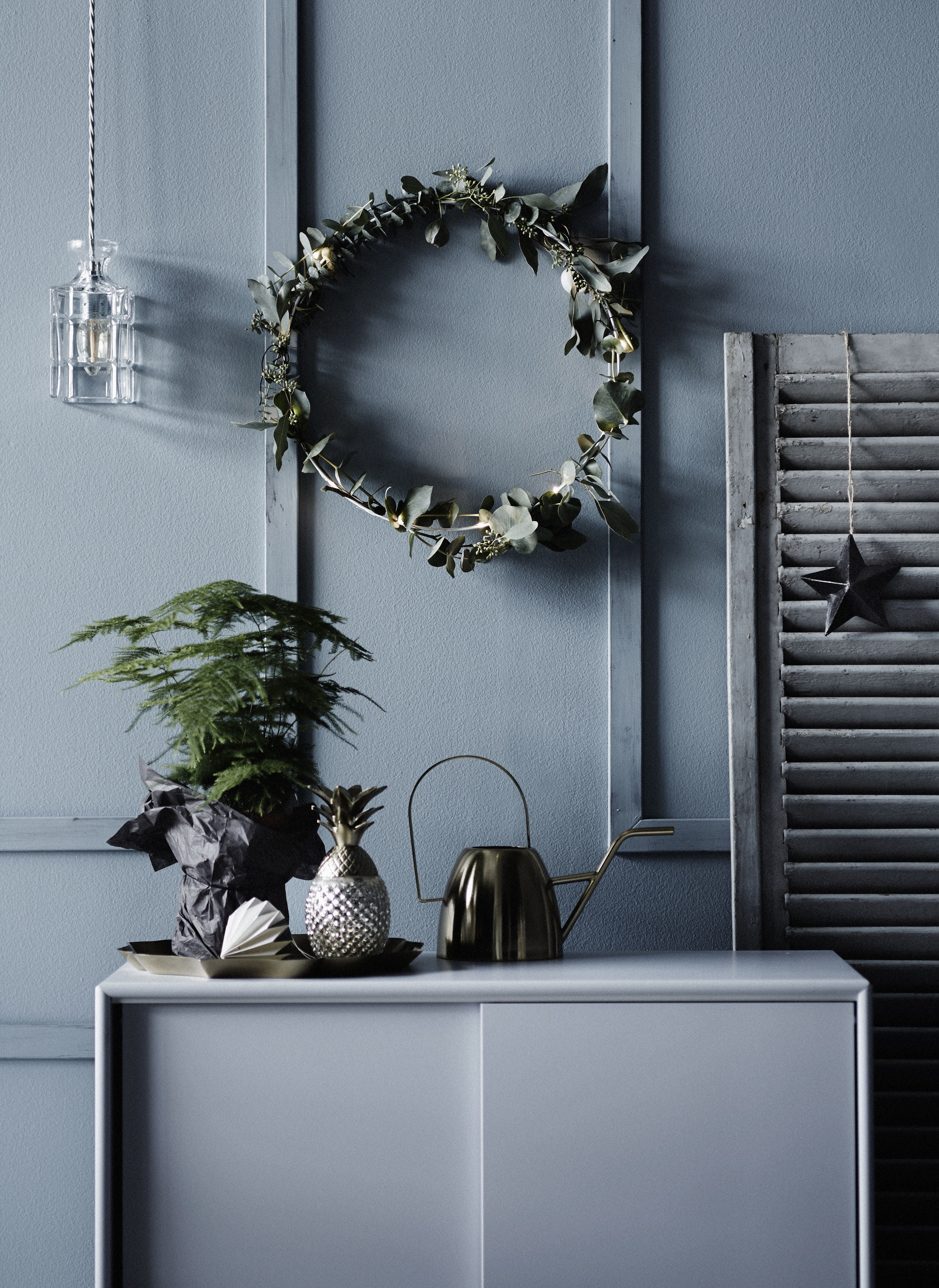 Metallirengas 2,90 e, ja Airamin led-valolanka 6,90 e, Kärkkäinen. Ebb & Flown kristallivalaisin 225 e, Formverk. Vaaleansininen Montanan liukuovikaappi, hintatiedustelut Vepsäläinen. Kaapin päällä ruukussa on parsa-kasvi, 14 e, Kaivokukka. Jali-tarjotin 29,90 e, Ananas-rasia 29,90 e ja Lotus-kastelukannu 29,90 e, Indiska. Paperinen joulukoriste 10,90 e / 4 kpl, Jotex. Ranskalainen vintage-ikkunaluukku 180 e, Armas Design. Musta tähti on kuvausrekvisiittaa. Koristepaneloitu seinä maalattiin Tikkurilan Harmony-maalilla, Symphony-värikartan sävy V438.
