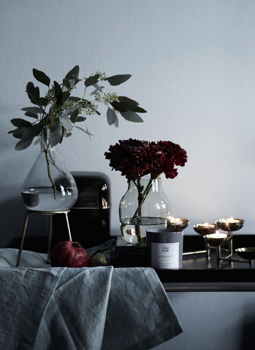 Julia-maljakolla on pyöreä pohja ja metallinen jalusta, 29,90 e, Indiska. Oyster-tuoksukynttilä on tyylikkäässä 1970-lukua henkivässä, tummassa purkissa, 197 e, Kartell. Muuton Silent-maljakko 35 e ja Gauharin Tranquility-tuoksukynttilä 38 e, Formverk. Asala-tuikkuteline 44,90 e, Indiska, ja tarjoiluvaunu 290 e, Moko. Pellavaliina kuvausrekvisiittaa.