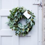 Yksinkertainen, kaunis joulukranssi syntyy eukalyptuksen oksasta, metallirenkaasta ja patterilla toimivasta valolangasta.