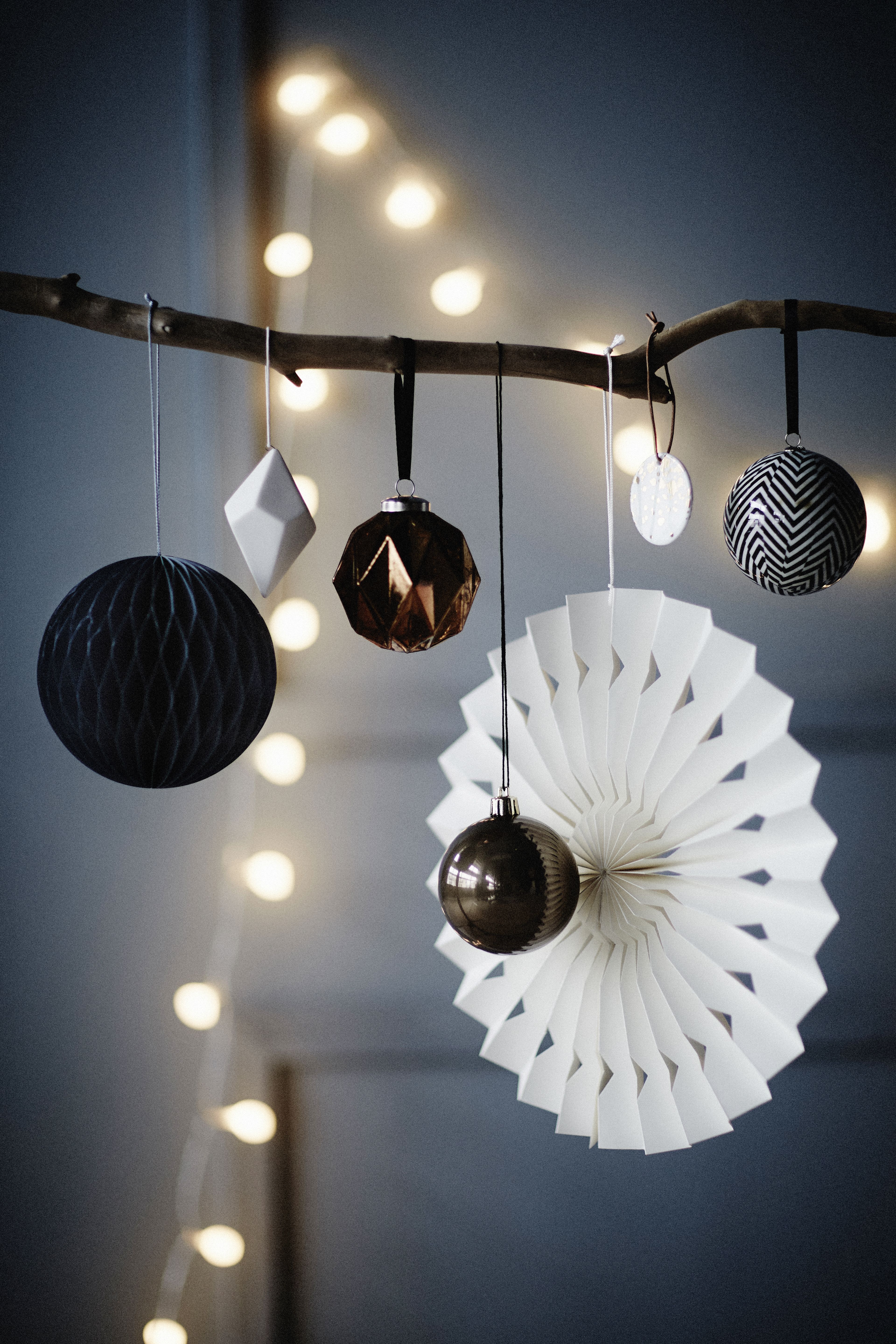Tumma paperipallo 10 e ja valkoinen timantti 5 e, Olkkari. Kuparinen, kulmikas koriste 6,99 e ja metallinen harmaasävyinen pallo 12,99 e / 54 kpl, Clas Ohlson. Valkoinen paperikoriste 6 e, Olkkari, Ferm Livingin keraaminen koriste 10 e, Formverk, ja mustavalkonen pallo 2,99 e, Clas Ohlson. Jouluvalot taustalla 25,80 e, Moko.