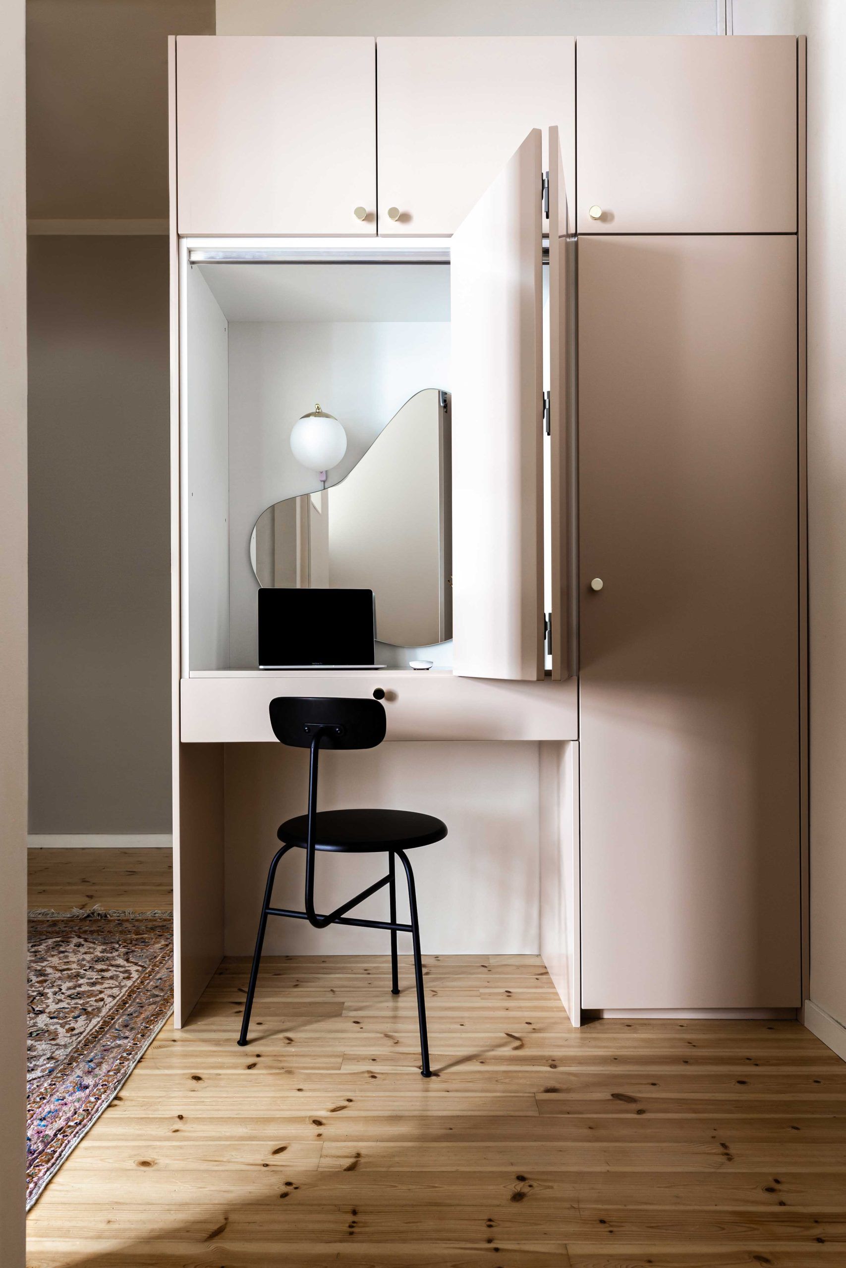 Makuuhuone on ensisijaisesti lepopaikka. Jos työpiste on sijoitettava makuuhuoneeseen, suosittelen kiintokalusteeseen integroitua ratkaisua. Työpisteen ovet voi sulkea päivän päätteeksi, etteivät työasiat osu silmiin.