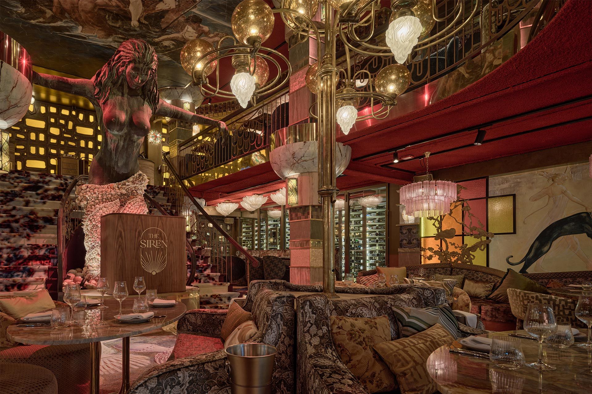 Tänä kesänä avautunut, välimerellinen The Siren on kaupungin kuumin ravintolauutuus. Maksimalistinen sisustus tuo mieleen meren pohjaan vajonneen entisaikojen luksusristeilijän. Kristallikruunujen ja kukikkaiden sohvien keskellä kohoaa kattoon asti ulottuva, simpukankuorilla päällystetty sireenipatsas, ja kalatiskin yllä roikkuvat valaisimet muistuttavat meduusoja. Joka pöydässä on nappi, jota painamalla tarjoilija tuo saman tien pullon samppanjaa.