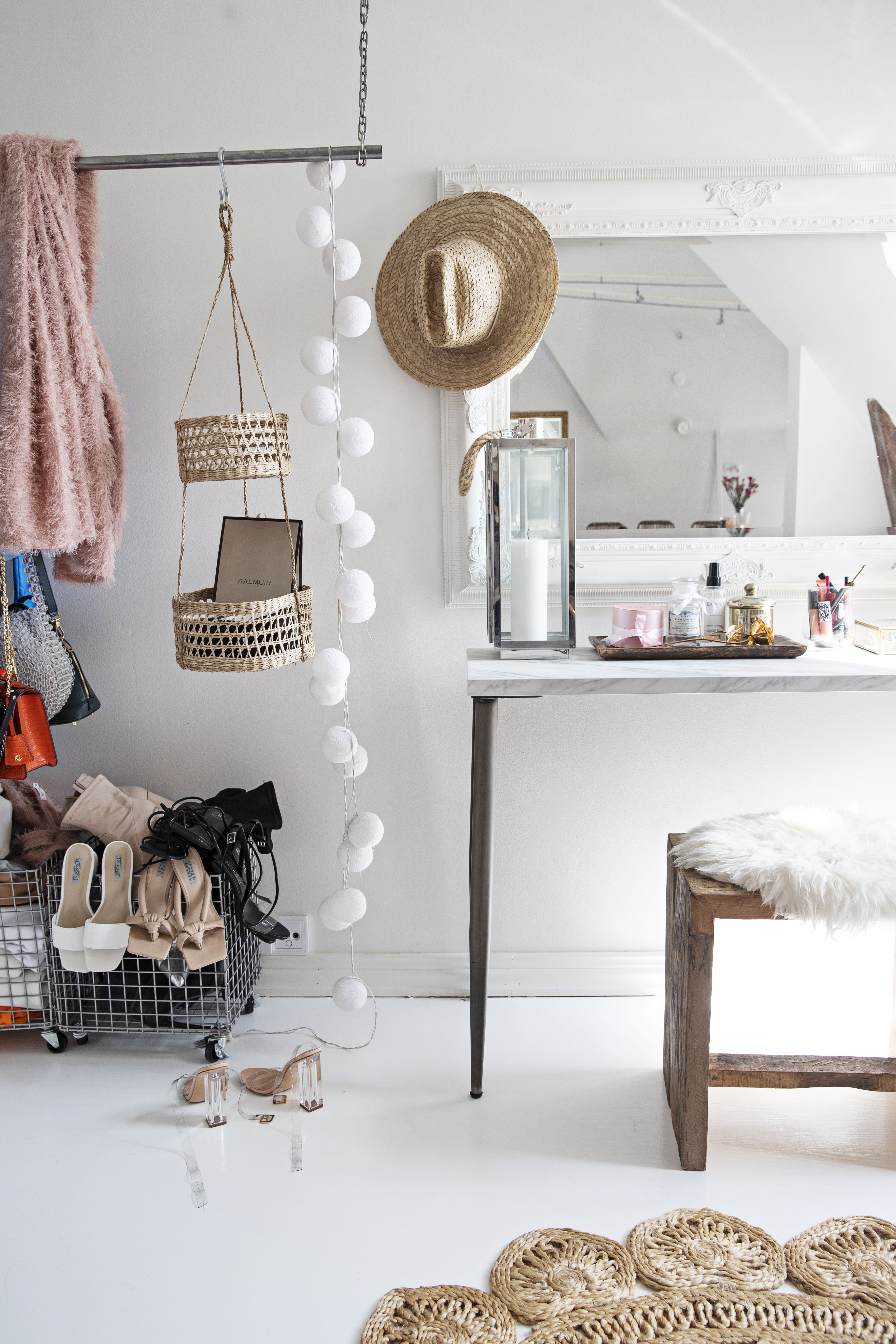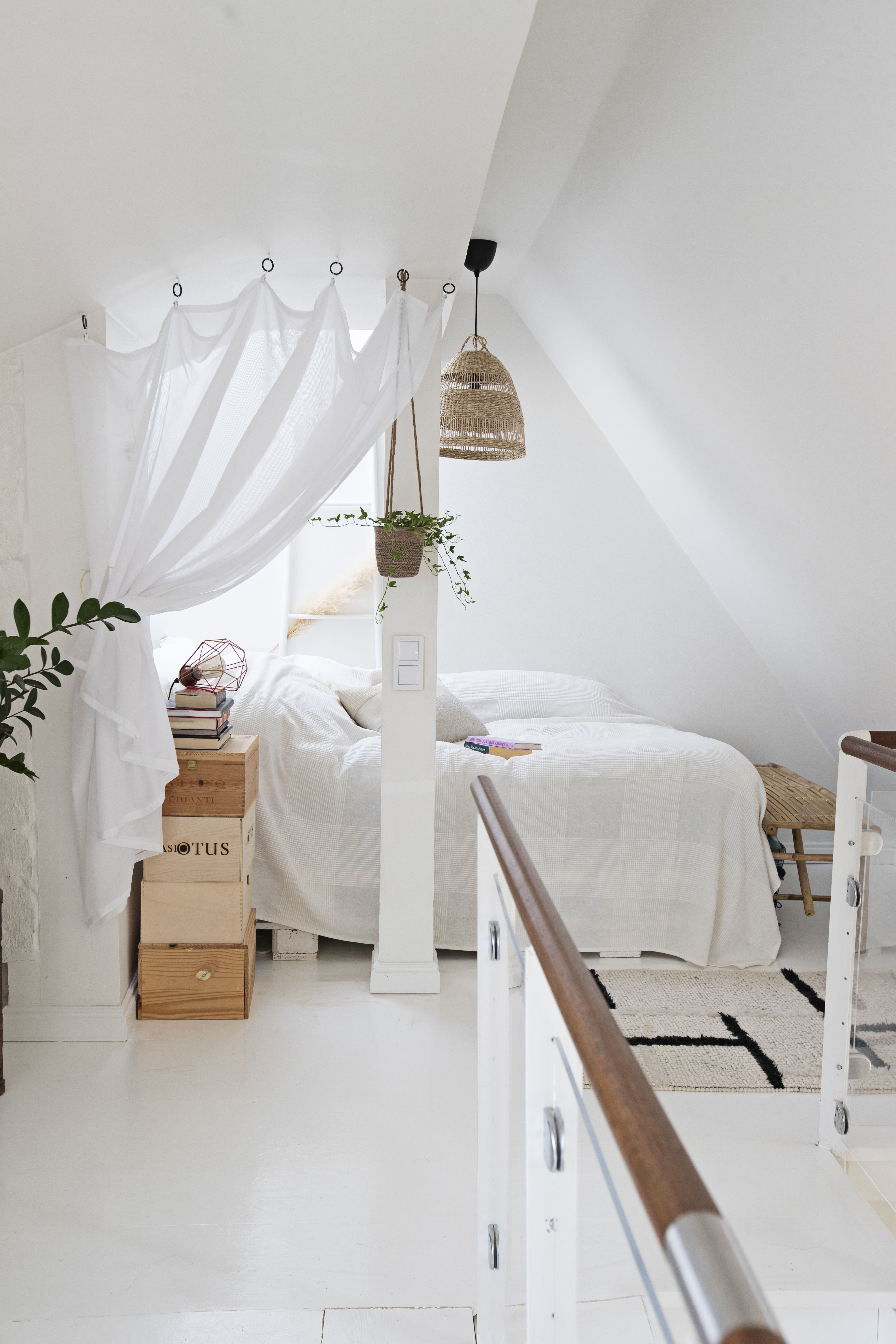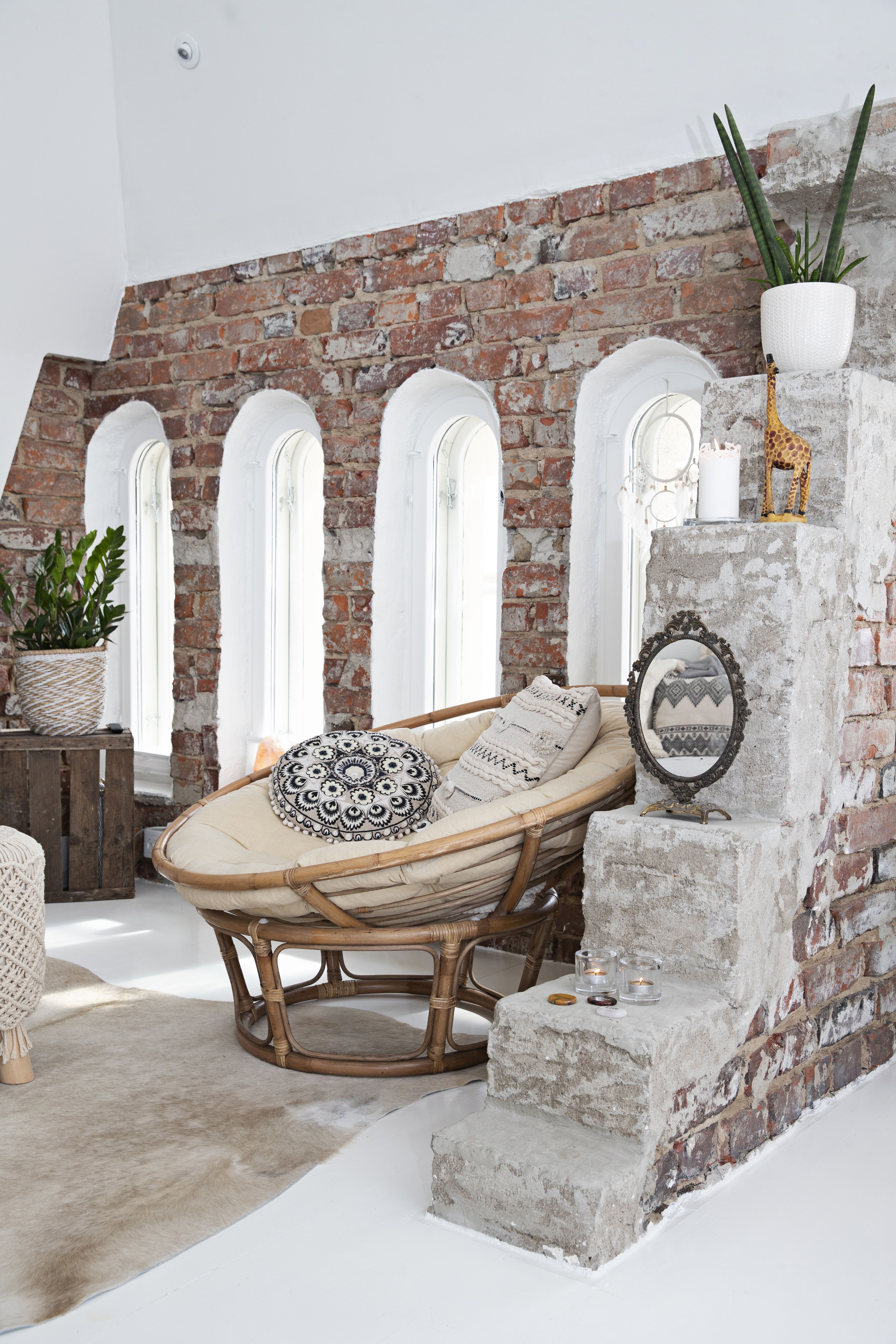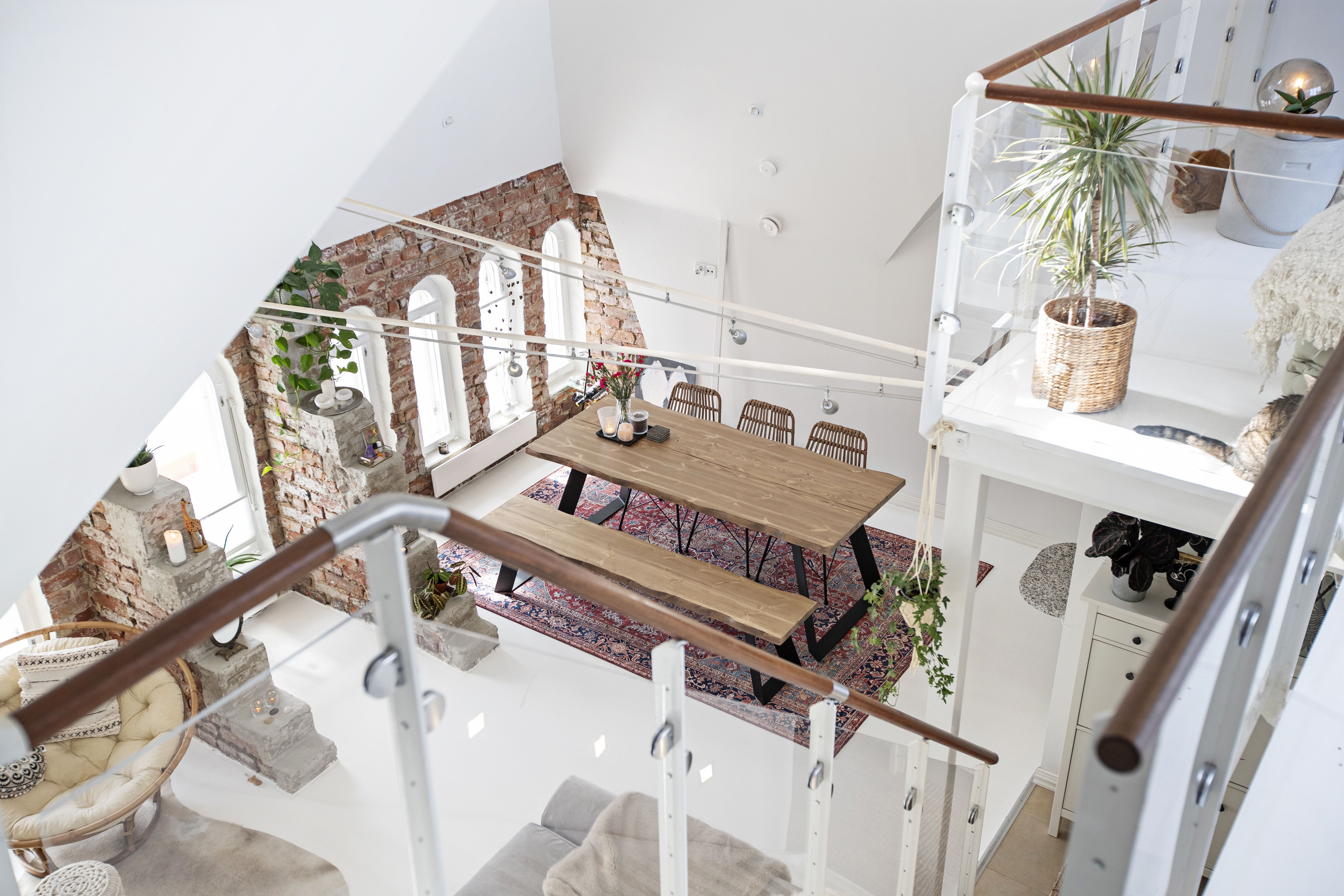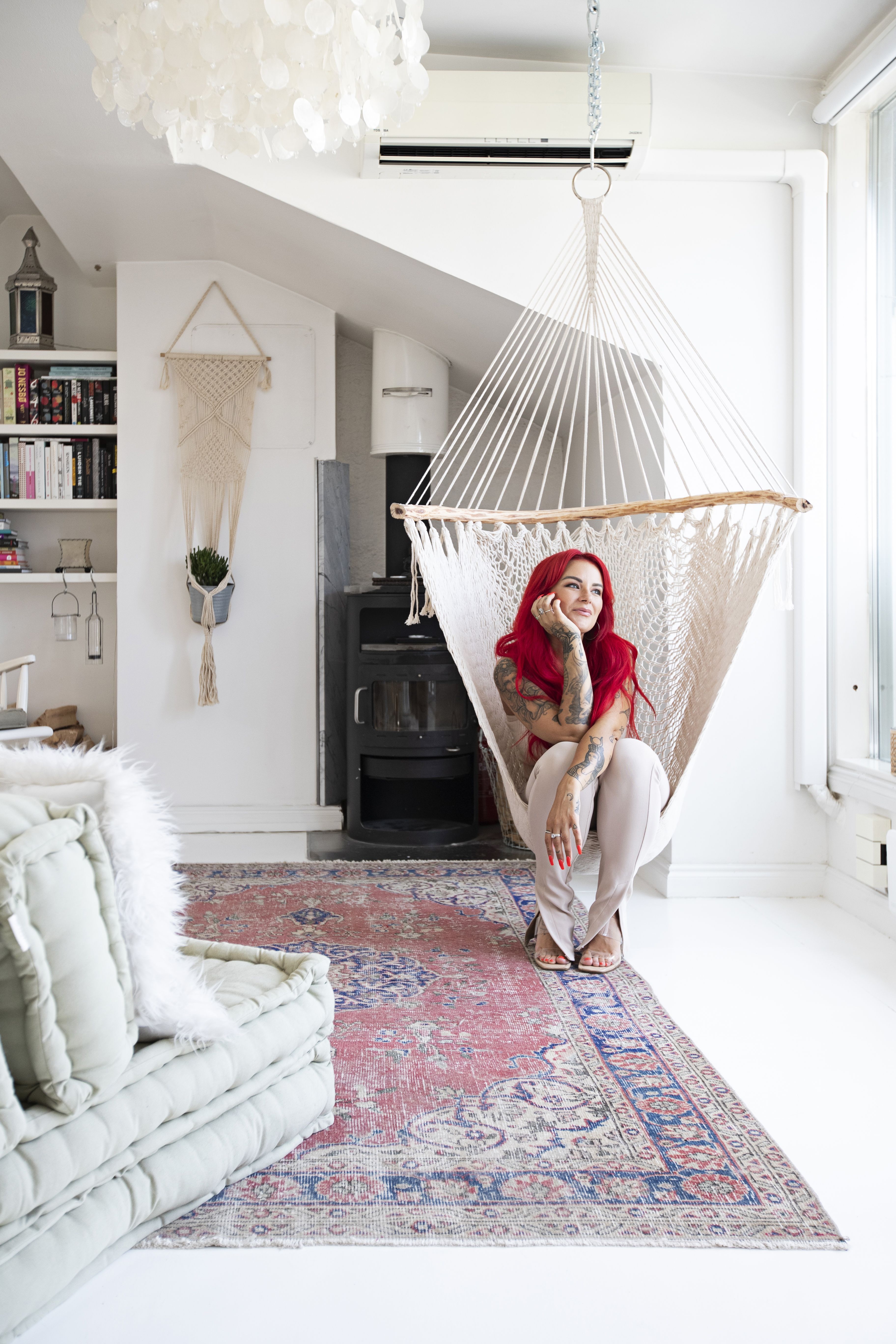 Asuin aiemmin vuokralla Annankadulla, jossa minulla oli ihana, kaksikerroksinen koti. Siksi halusin, että myös ensimmäisessä omistusasunnossani olisi kaksi kerrosta ja jotain uniikkia. Helsingin Punavuoresta oli kuitenkin vaikeaa löytää kaksikerroksisia asuntoja, joten etsin sopivaa kotia pitkään. Kun lopulta puolitoista vuotta sitten näin tämän asunnon, oli päätös saman tien selvä. Tila on saneerattu ullakosta asunnoksi vuonna 2000, ja rakastuin kodin kaari-ikkunoihin, tiiliseinään sekä lähes seitsemään metriin ulottuvaan huonekorkeuteen. En seuraa sisustustrendejä vaan viihdyn tiloissa, joissa on lämmin ja kodikas fiilis. Pidän bohotyylistä ja itämaisista vaikutteista. Tähän elämänvaiheeseen tämä koti on täydellinen, koska saan elää aivan kaupungin ytimessä. Tulevaisuudessa haaveilen siitä, että minulla olisi myös joku paikka luonnon keskellä, jossa voisin ladata akkuja.