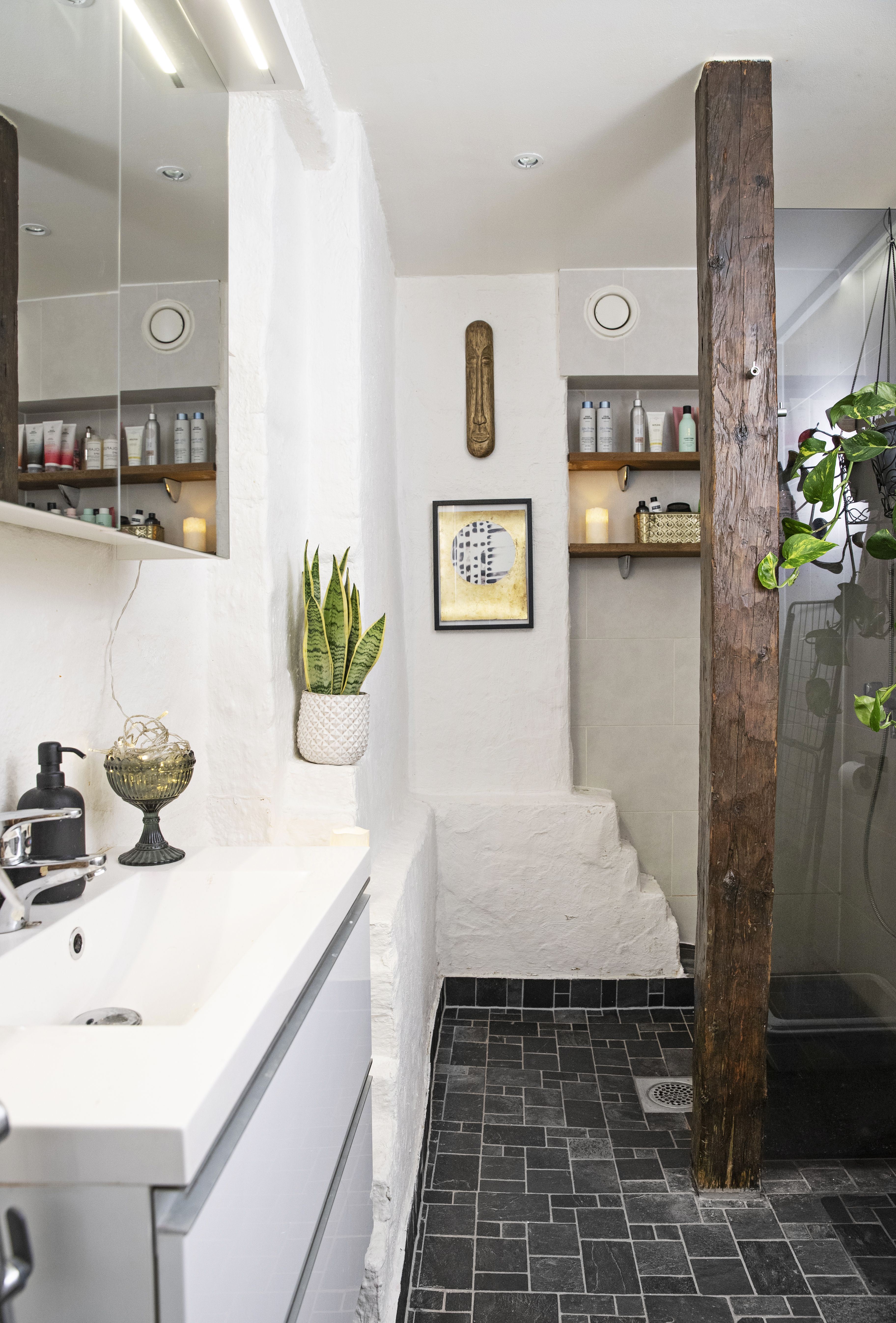 Kylpyhuoneen alkuperäiset puuparrut muistuttavat asunnon historiasta ullakkona.