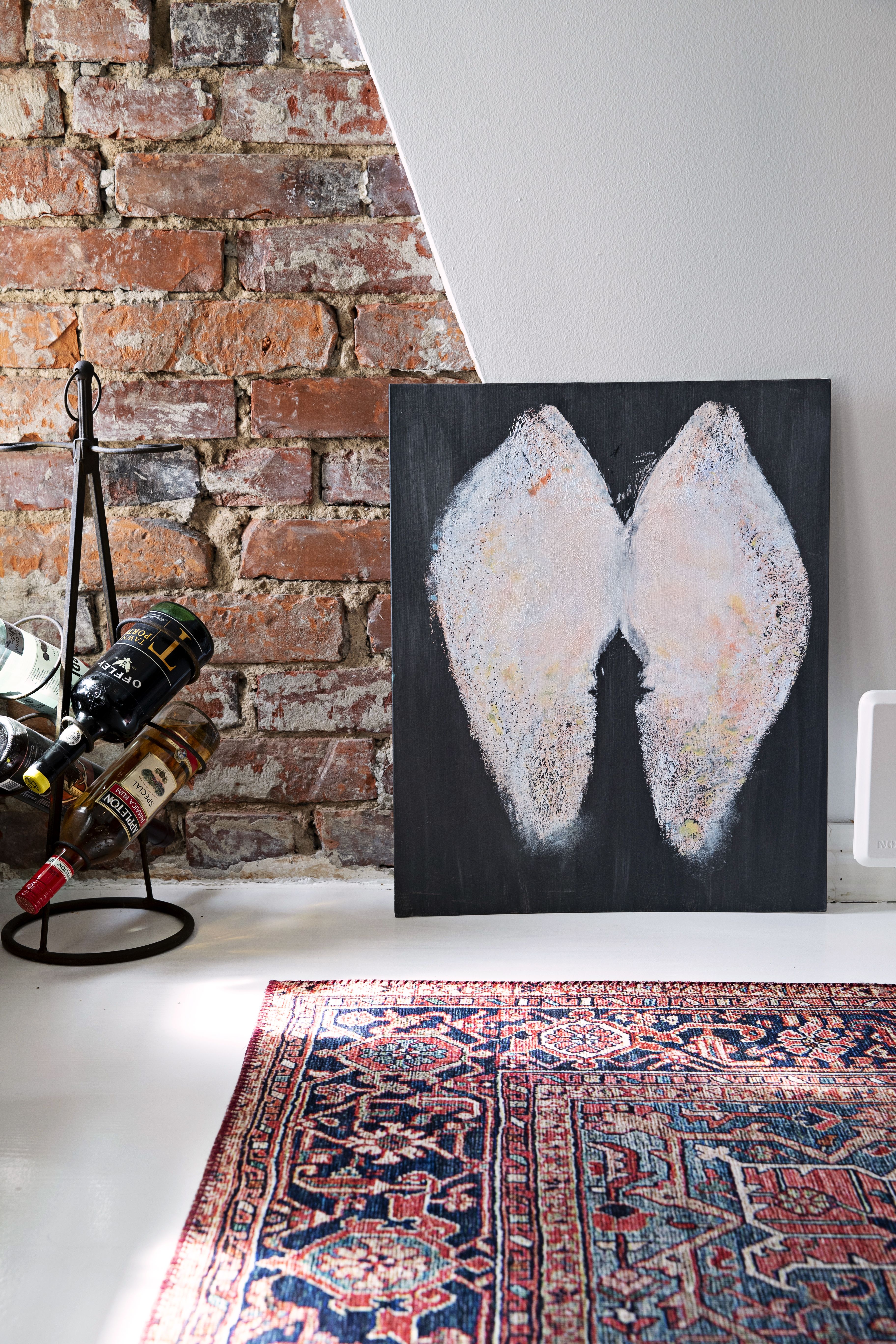 ”Tiiliseinä oli rapattu valkoiseksi, mutta halusin saada sen esille. Sitä nikkaroitiin esille toista viikkoa, mutta se oli sen arvoista”, Tinze sanoo. Peili on isomummon peruja.
