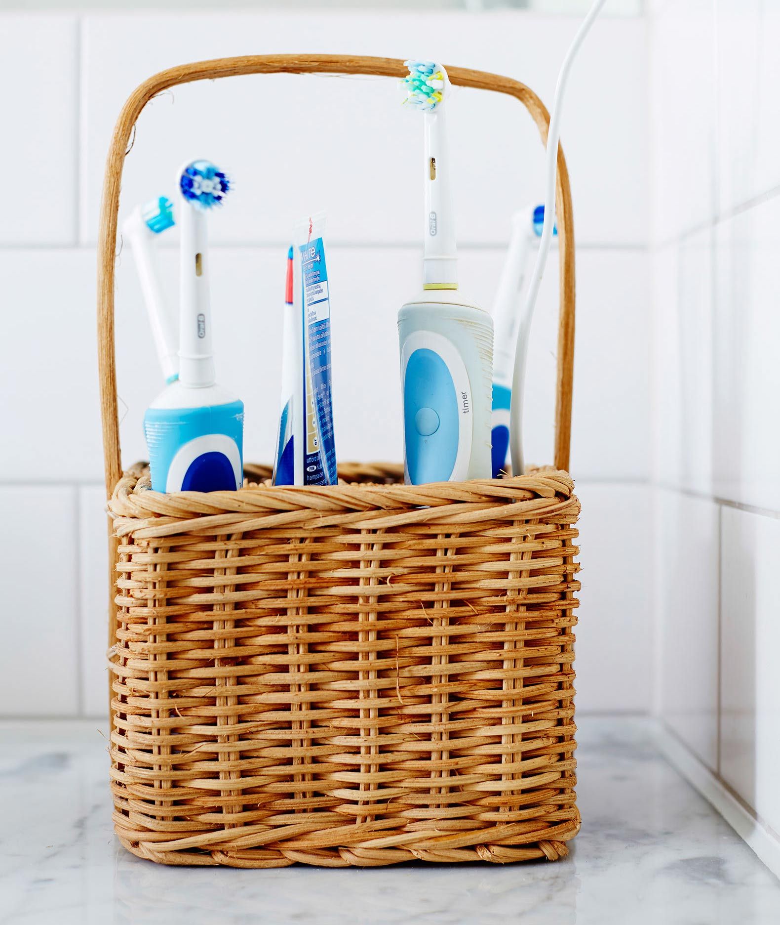 Kaatuilevat sähköhammasharjat pysyvät ojennuksessa keittiön öljypullotelineessä. Siitä jokainen perheenjäsen löytää nopeasti omansa. Hammasharjan laturin saa myös kätevästi piilotettua korin pohjalle. Punottu kori sietää myös puhdistuksen vedellä. Nipprig 2015 -kori, 4,99 e, Ikea.