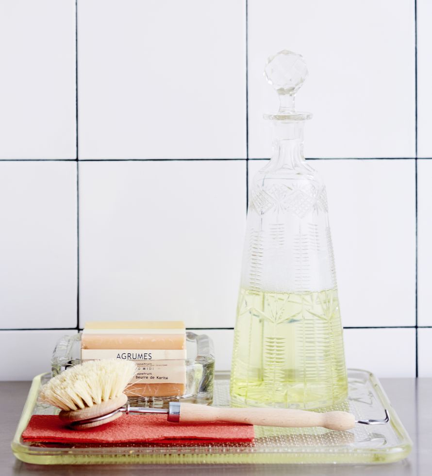 Keittiön tiskitasolle voi luoda kauniin kokoelman tavallisista arjen tarpeellisista asioista. Kaiva vanhat lasiesineet ja kristallit kaappien kätköistä tai hanki niitä kirpputorilta. Kuvassa vanha tuhkakuppi toimittaa saippuatelineen virkaa. Kierrätyskeskuksesta löydetty mikroaaltouunin lautanen käy kätevästä tarjottimesta, jolle tiskiharjan, rätin ja saippuat voi siististi koota. Astiapesuaine on puolestaan kaadettu rumasta muovipullostaan vanhaan, kauniiseen kristallikarahviin.