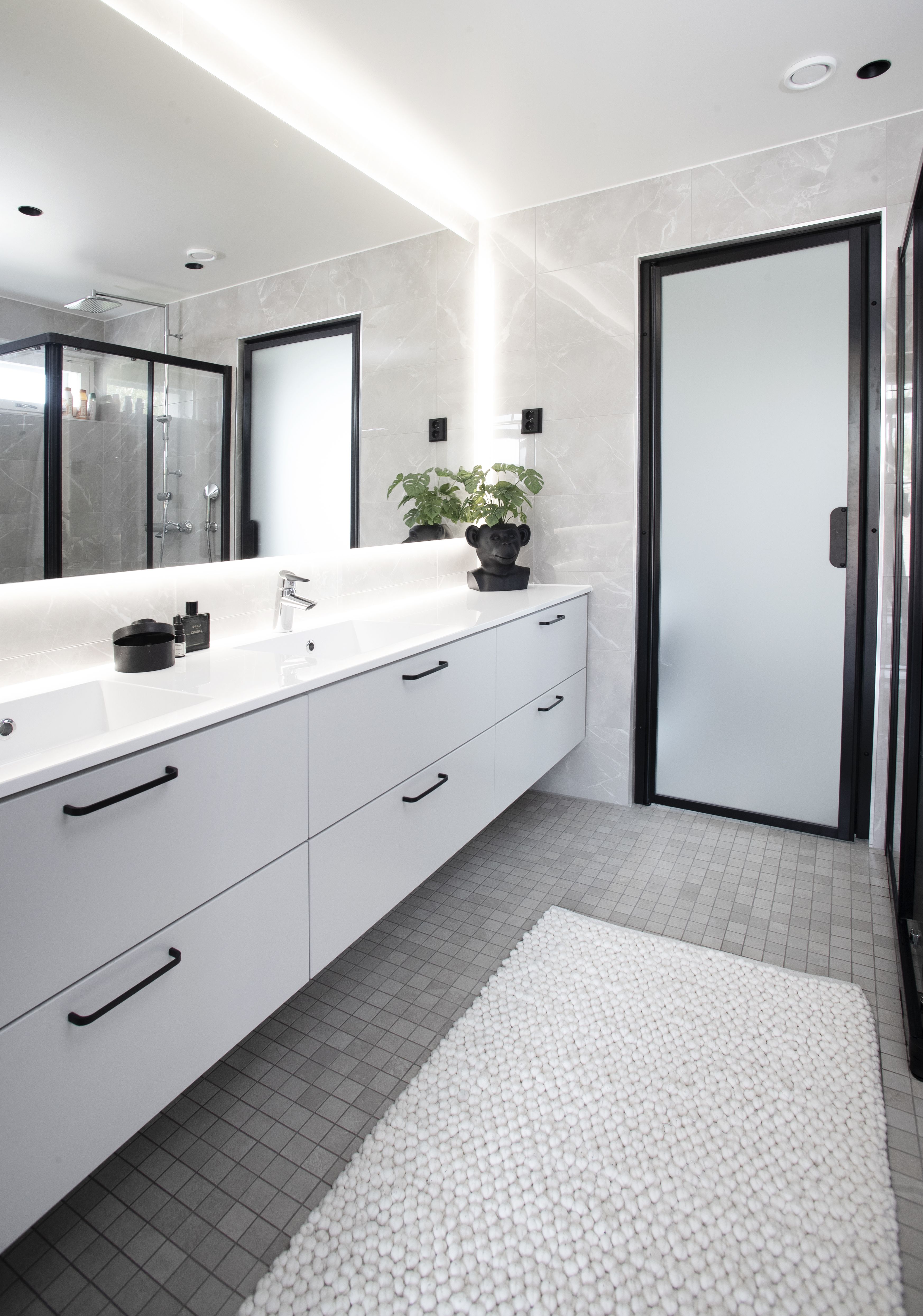 Halusin asuntoon runsaasti tilaa vaatteille, joten korvasin suunnitteluvaiheessa saunan kunnon vaatehuoneella. Nyt vaatehuoneita on kaksi: toisessa ovat jokapäiväiset käyttövaatteet, kengät ja laukut, kun taas eteisen yhteydessä olevassa huoneessa säilytän ulkovaatteita. Olen tosi kiinnostunut muodista ja pukeutumisesta, ja olenkin käynyt monesti Pariisin muotiviikoilla. Suosikkisuunnittelijani on Raf Simons, ja vaatteita ostan useimmiten netistä tai helsinkiläisestä The New Room -kivijalkaliikkeestä. Kotini on niin uusi ja virheetön, että siitä tekee mieli pitää hyvää huolta. Olen alkanut muistuttaa faijaani, kun siivoan nykyään ihan raivopäänä. Imuroin täällä joka päivä - sitä ei todellakaan tapahtunut lapsuudenkodissani.