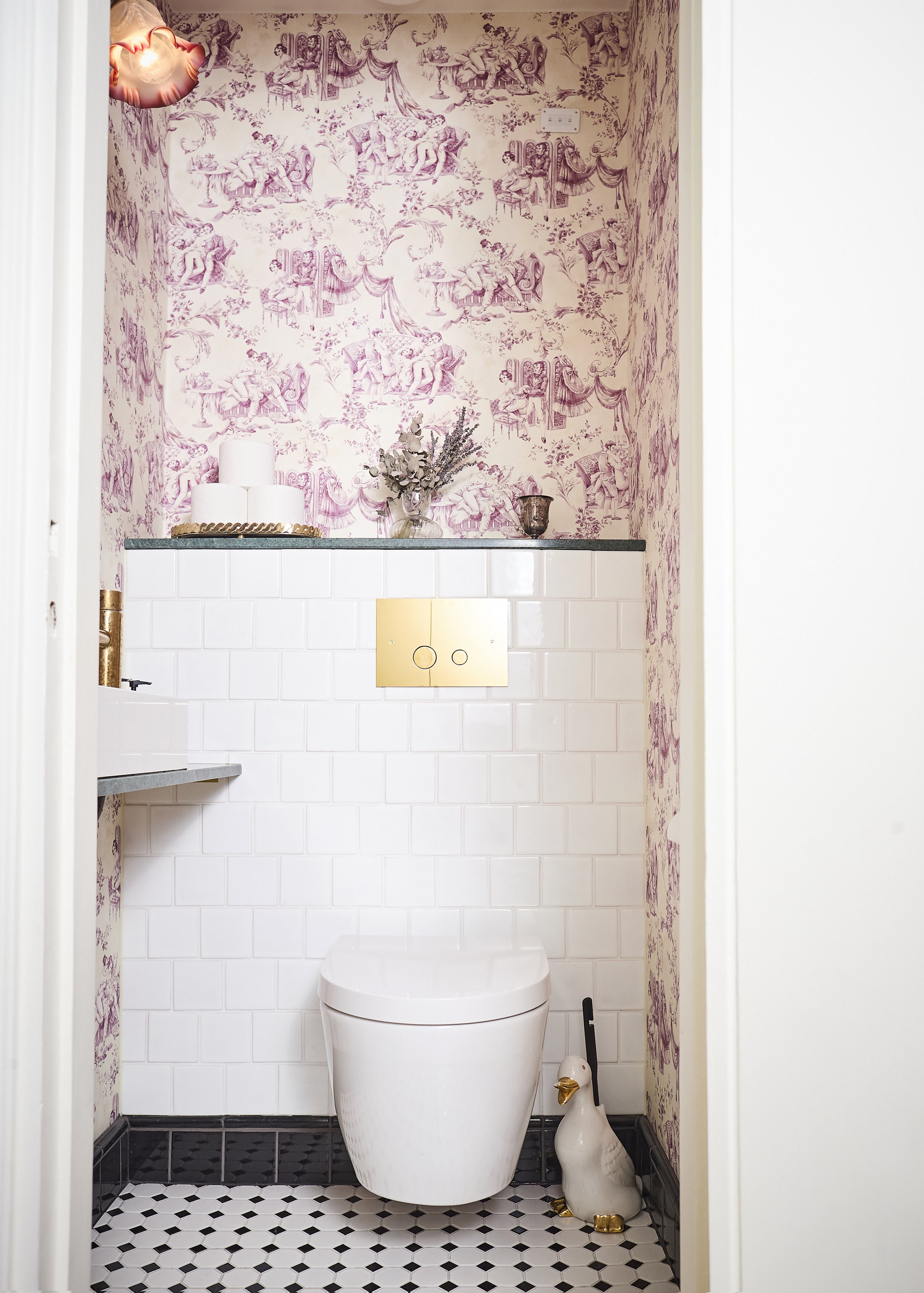 Pienessä erillisessä wc:ssä halusimme vähän leikitellä. Wc:stä tuli hauska oma detaljinsa, joka rikkoo vaaleaa yleisilmettä mielestäni kivasti. Välillä toivon, että sisustuksemme olisi rohkeampi ja värikkäämpi, mutta yksinkertainen tyyli sopinee 1930-luvun taloon paremmin. Vaalea koti myös rauhoittaa mieltäni tässä vauhdikkaassa ja ärsykkeitä tulvillaan olevassa elämäntilanteessamme.