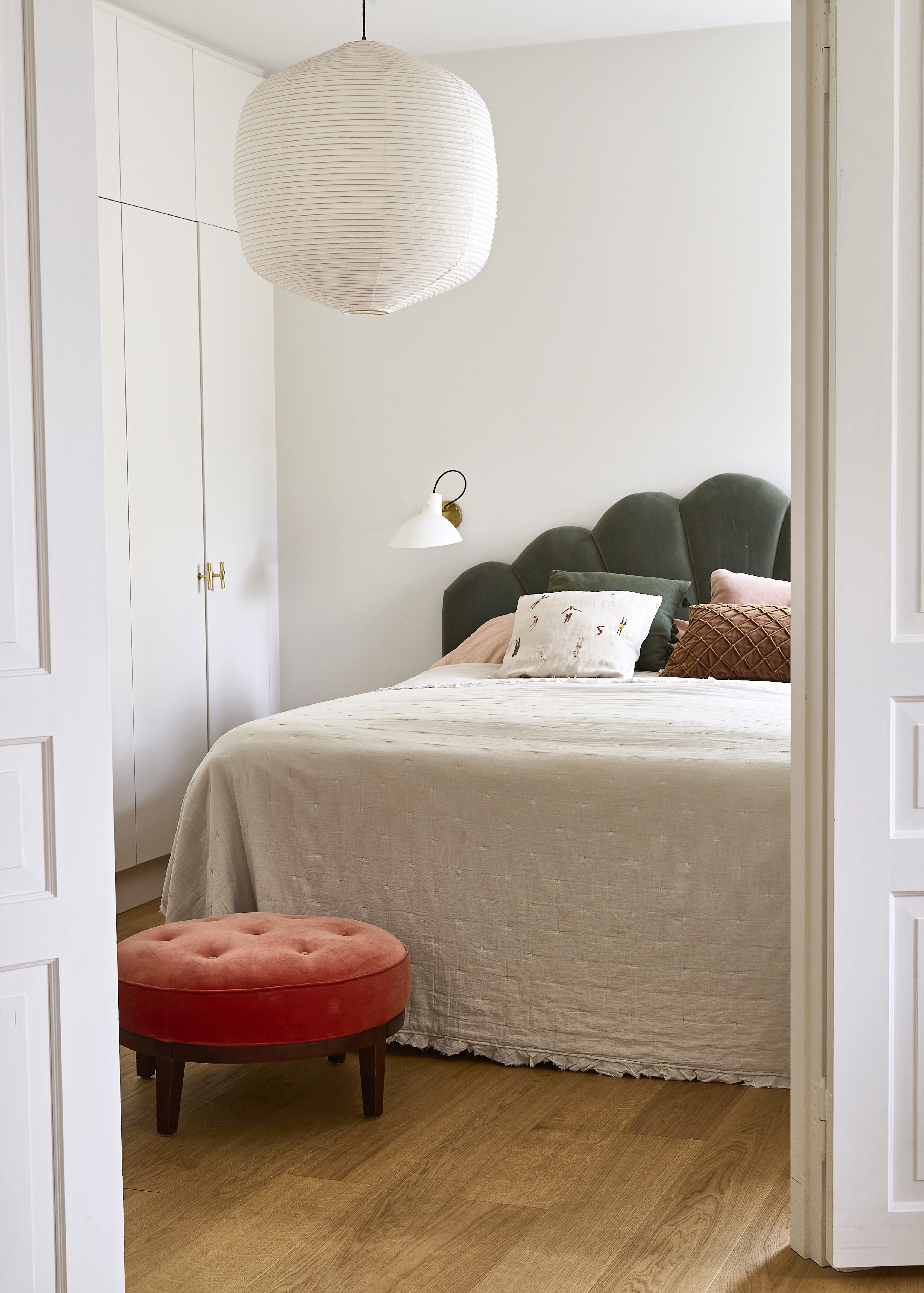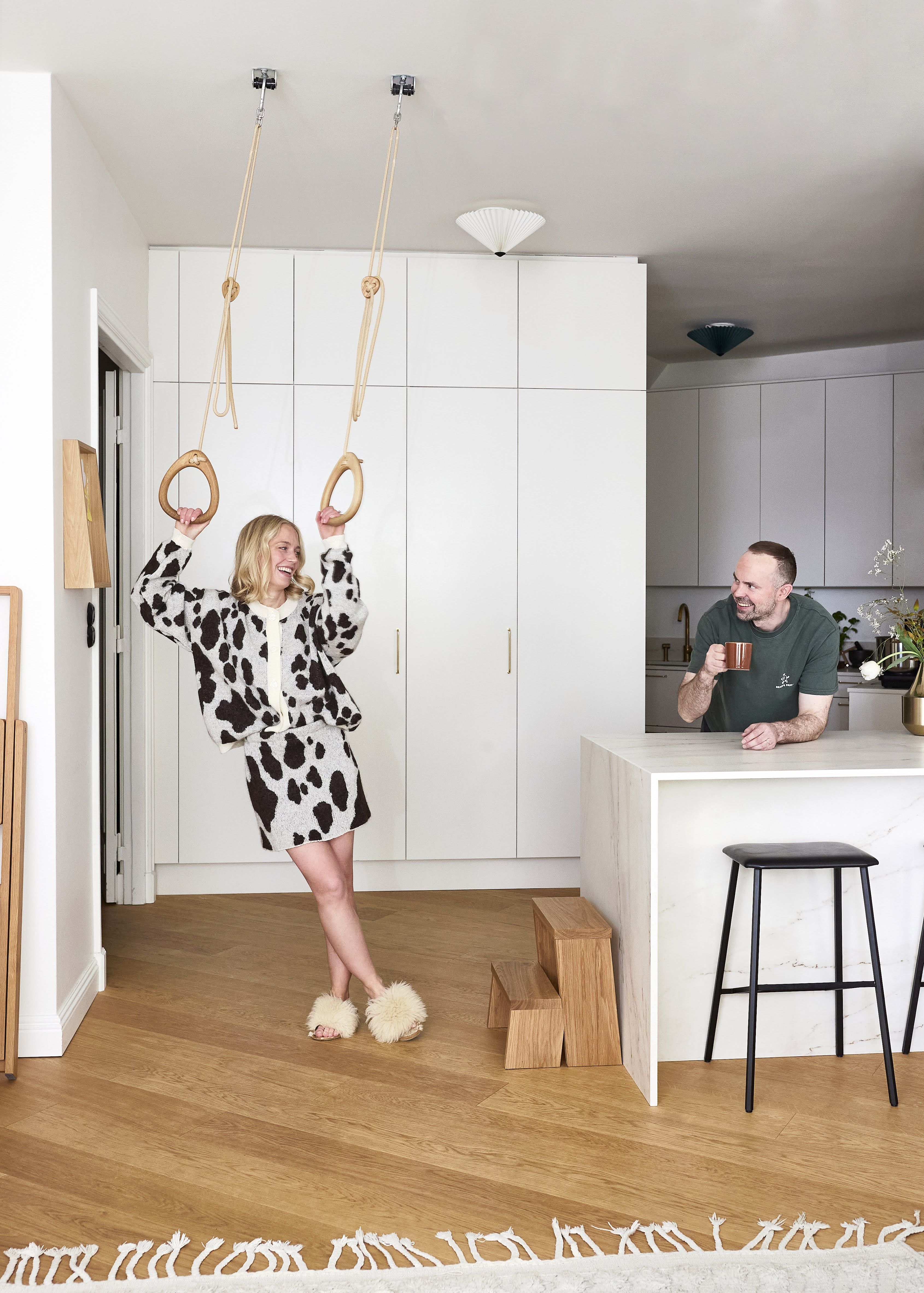 Remontoitava kohde vastuineen ja lainoineen oli molemmille iso kasvunpaikka. Asunnon sokkeloinen pohja oli myös melkoinen haaste. Osa huoneista pysyi paikoillaan, ja osan seinistä kaadoimme avartaaksemme tiloja. Asunnossa on luonnetta: alun ongelmakohdista kuten vinoista seinistä ja kulmikkuudesta onkin tullut suoranaisia kotimme helmiä. Inspiroiduimme pohjan vinoudesta niin, että tammiparketti asennettiin diagonaaliin.