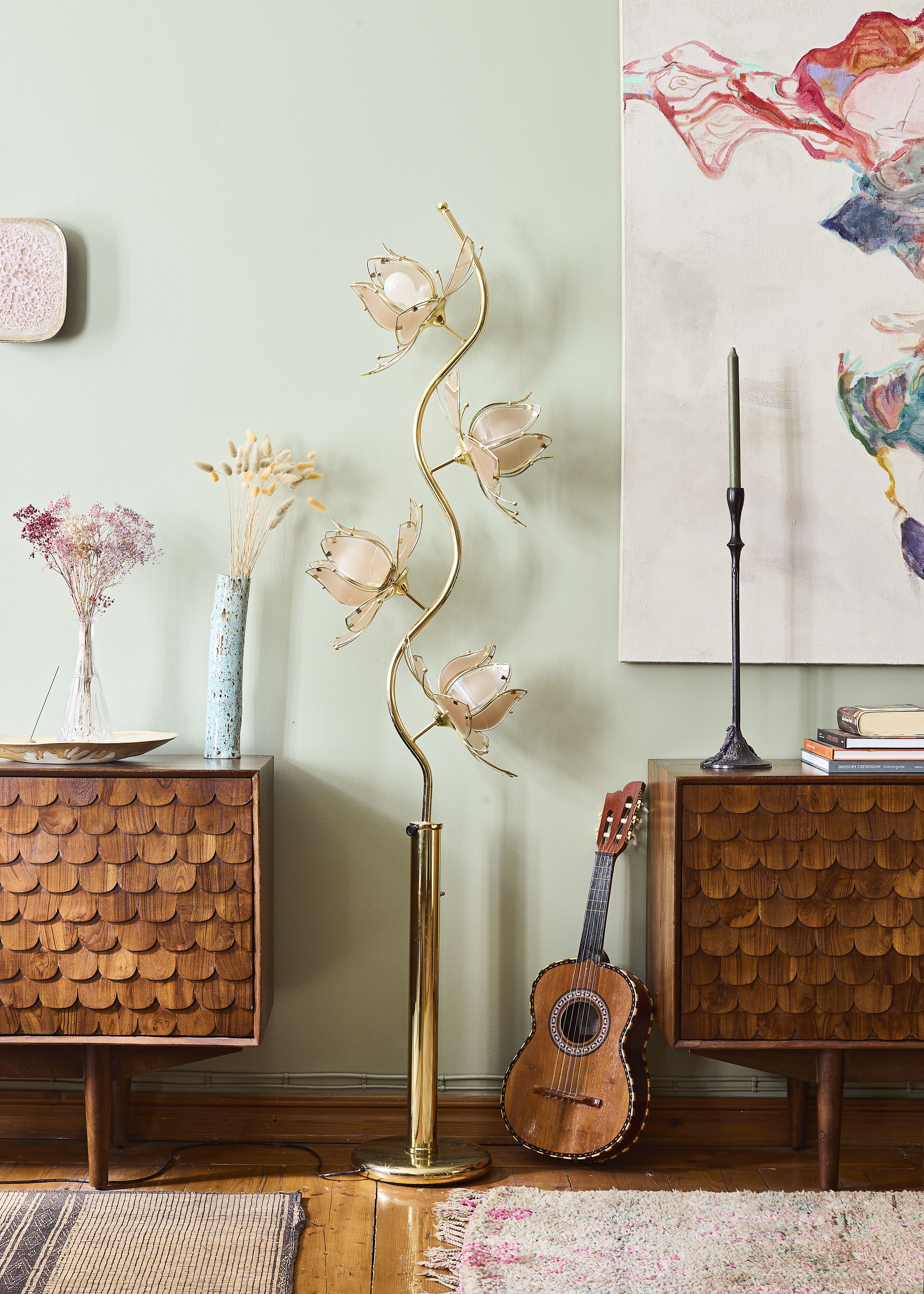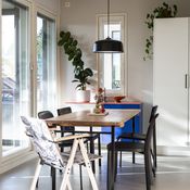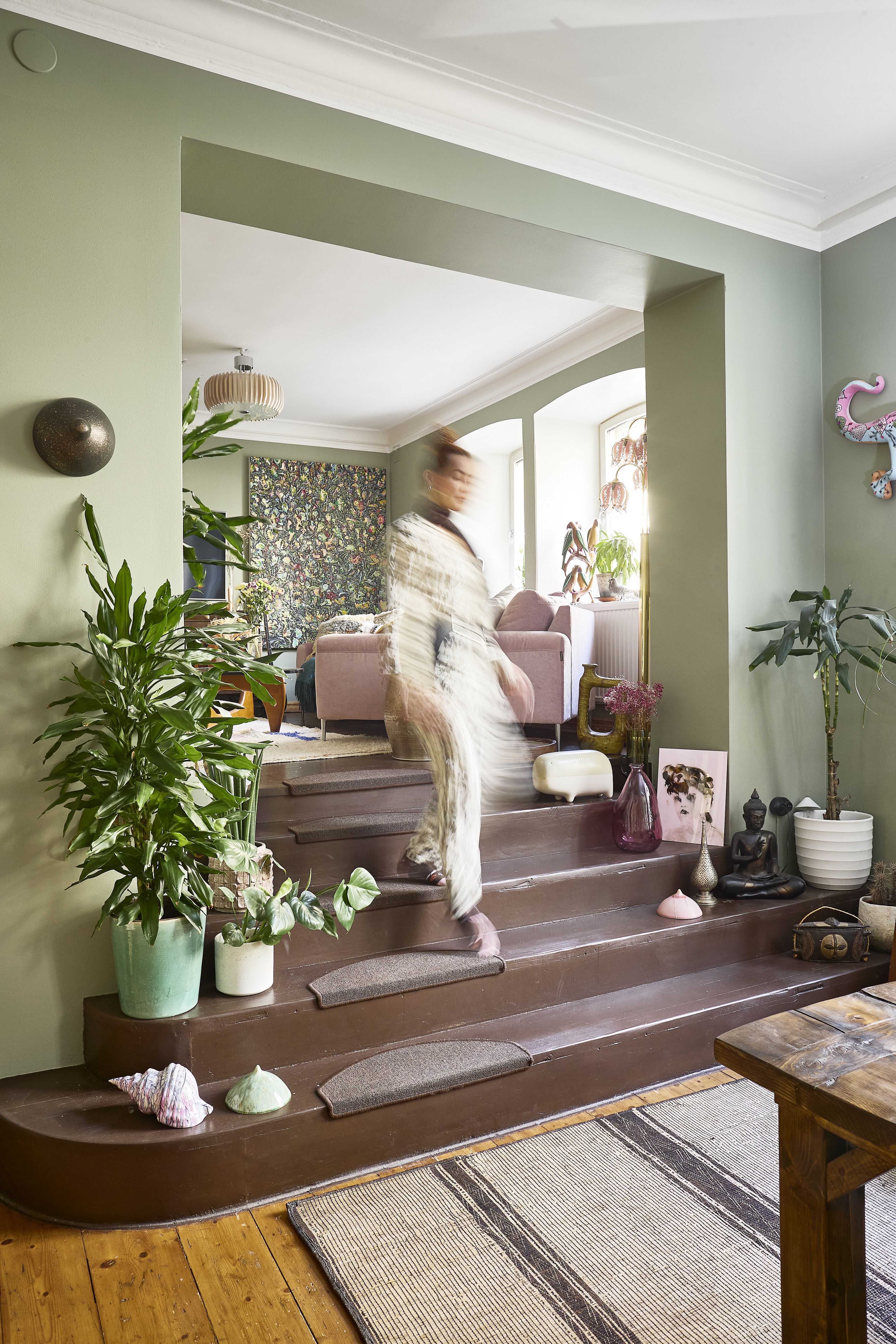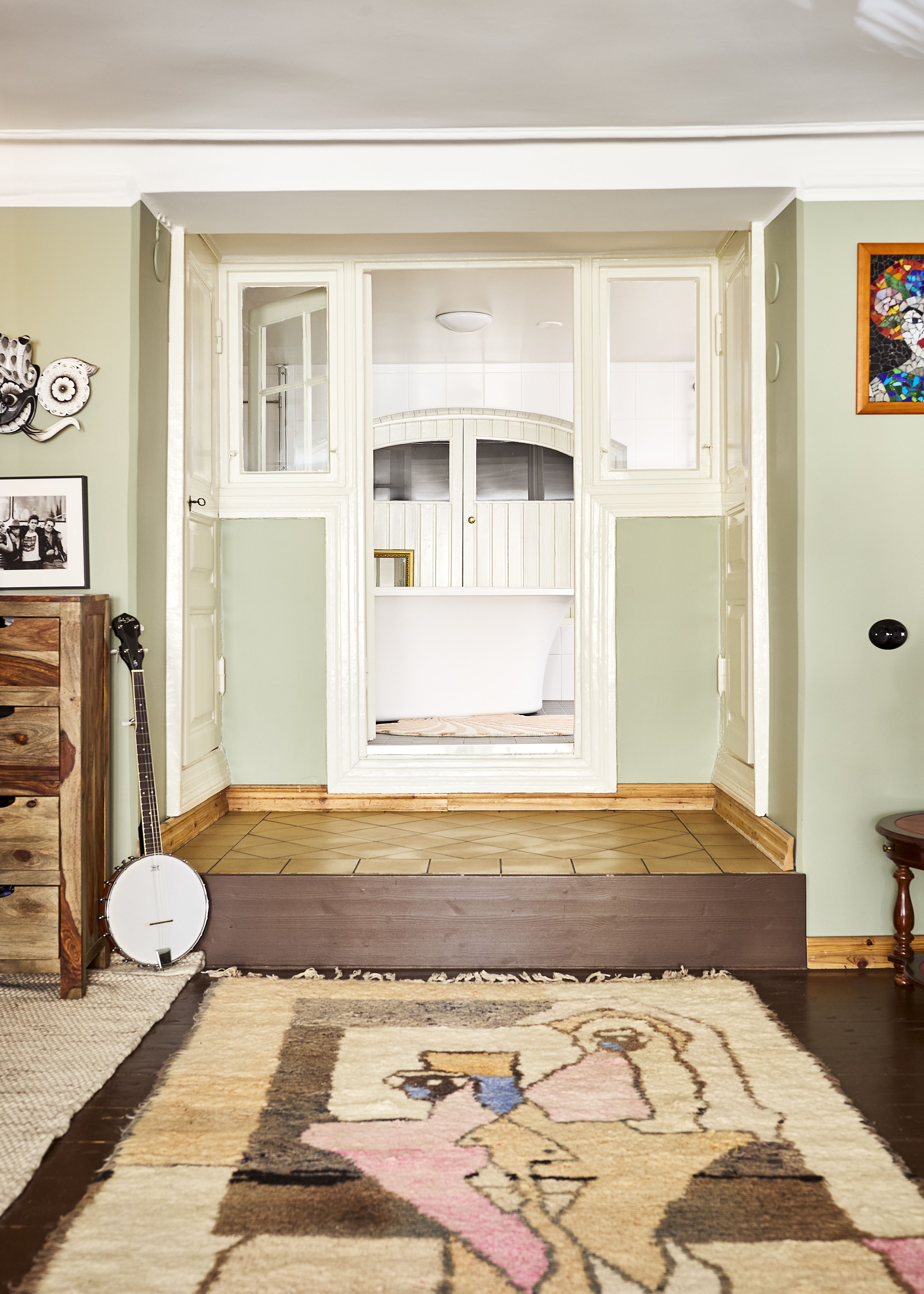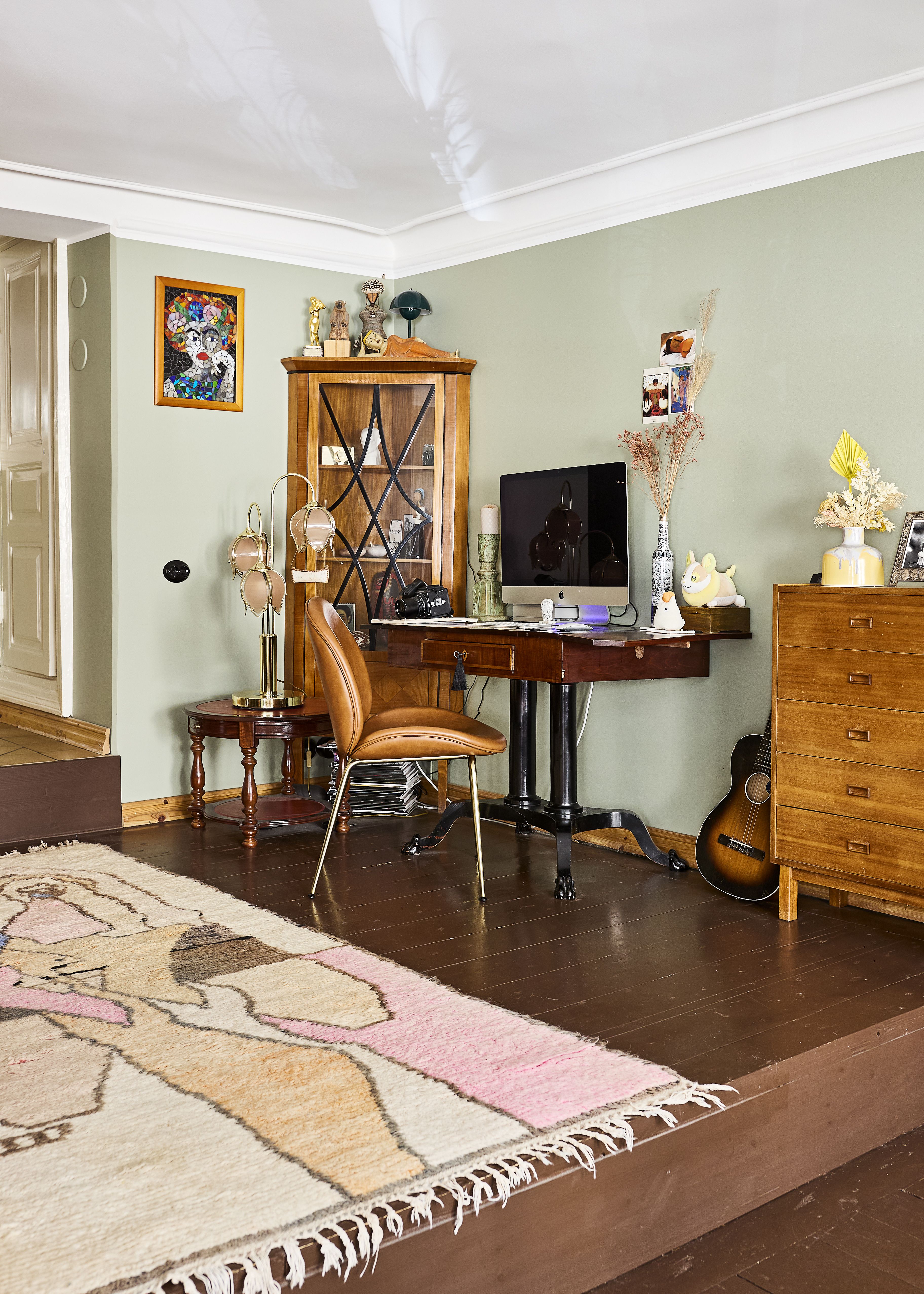 Rakastan aistillisuutta. Näköaistia ruokkii estetiikka, muistot ja tarinallisuus. Meillä on paljon värejä, ja ne sekä energisoivat että maadoittavat. Materiaalien tuntu on minulle tärkeää. Lattia on alkuperäinen, sen kulumat kertovat omaa tarinaansa 150 vuoden ajalta. Minulla on tapana tanssia aamubiisi. Rakastan sitä, miltä puulattia tuntuu paljailla jaloilla - tai miten erilaiselta pehmeä villamatto tai karhea bambumatto.