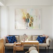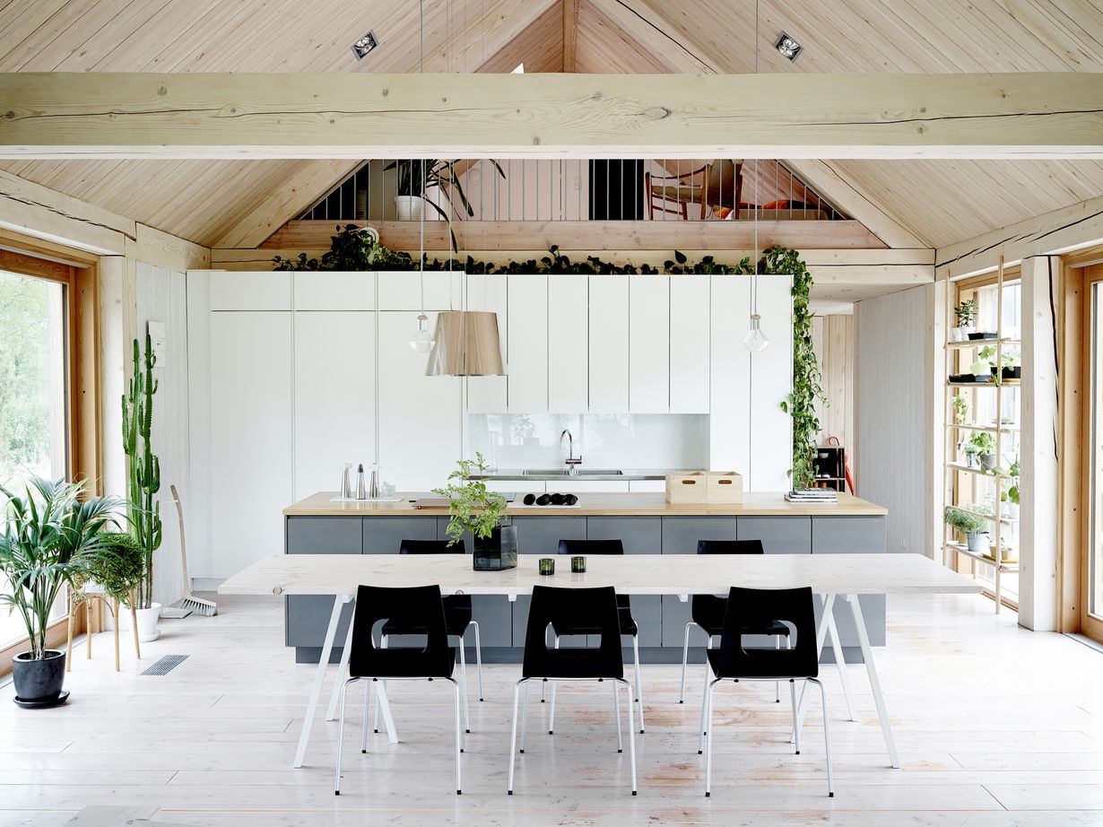 Sonja ja Mathias halusivat tilavan olohuoneen ja avokeittiön. Suuret ikkunat aukeavat kaikkiin suuntiin. Ruokailutilan he sijoittivat keittiön ja olohuoneen väliin. Tämän suuren tilan lisäksi kotiin haluttiin vain vanhempien makuuhuone, lastenhuone ja työhuone.
