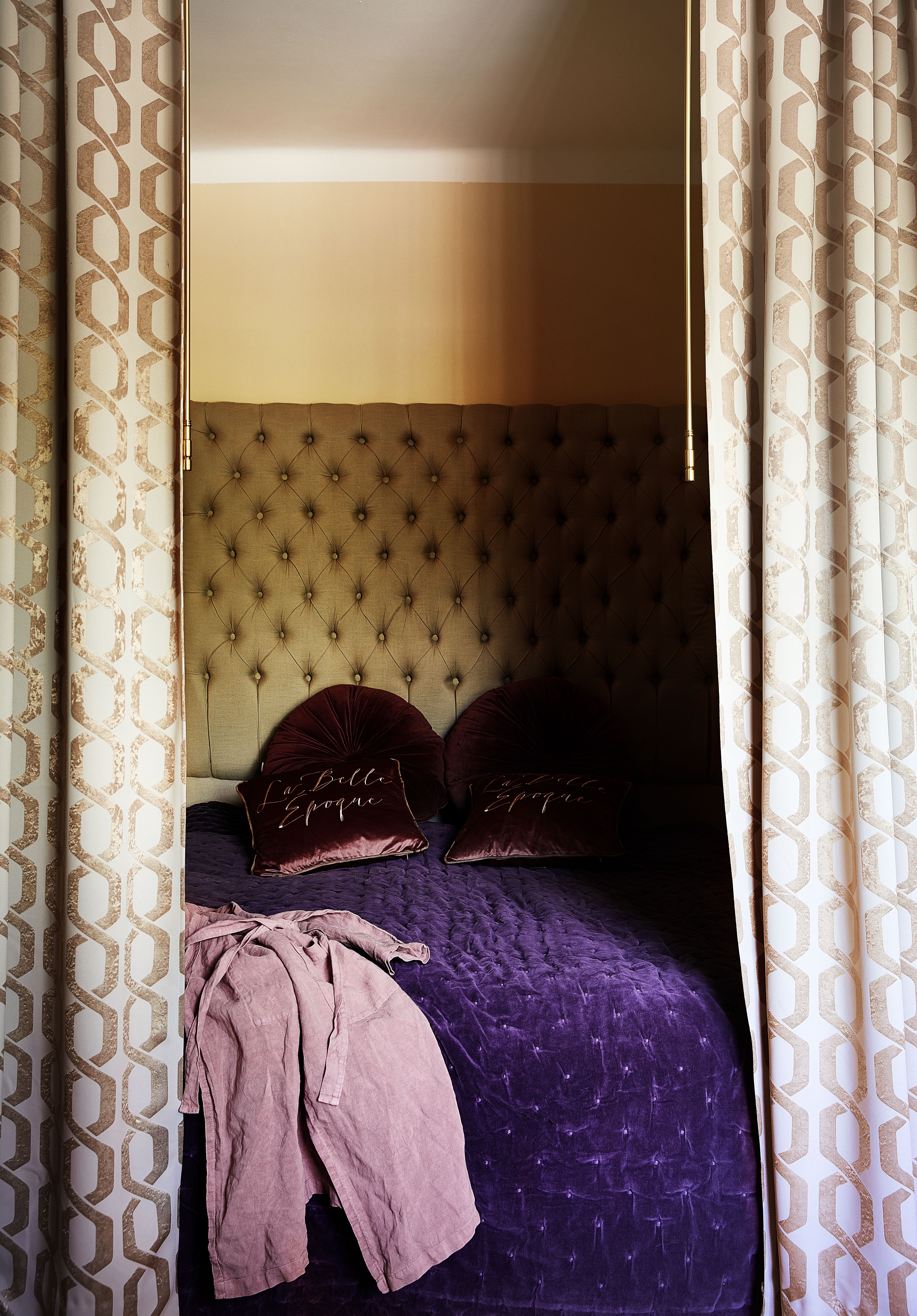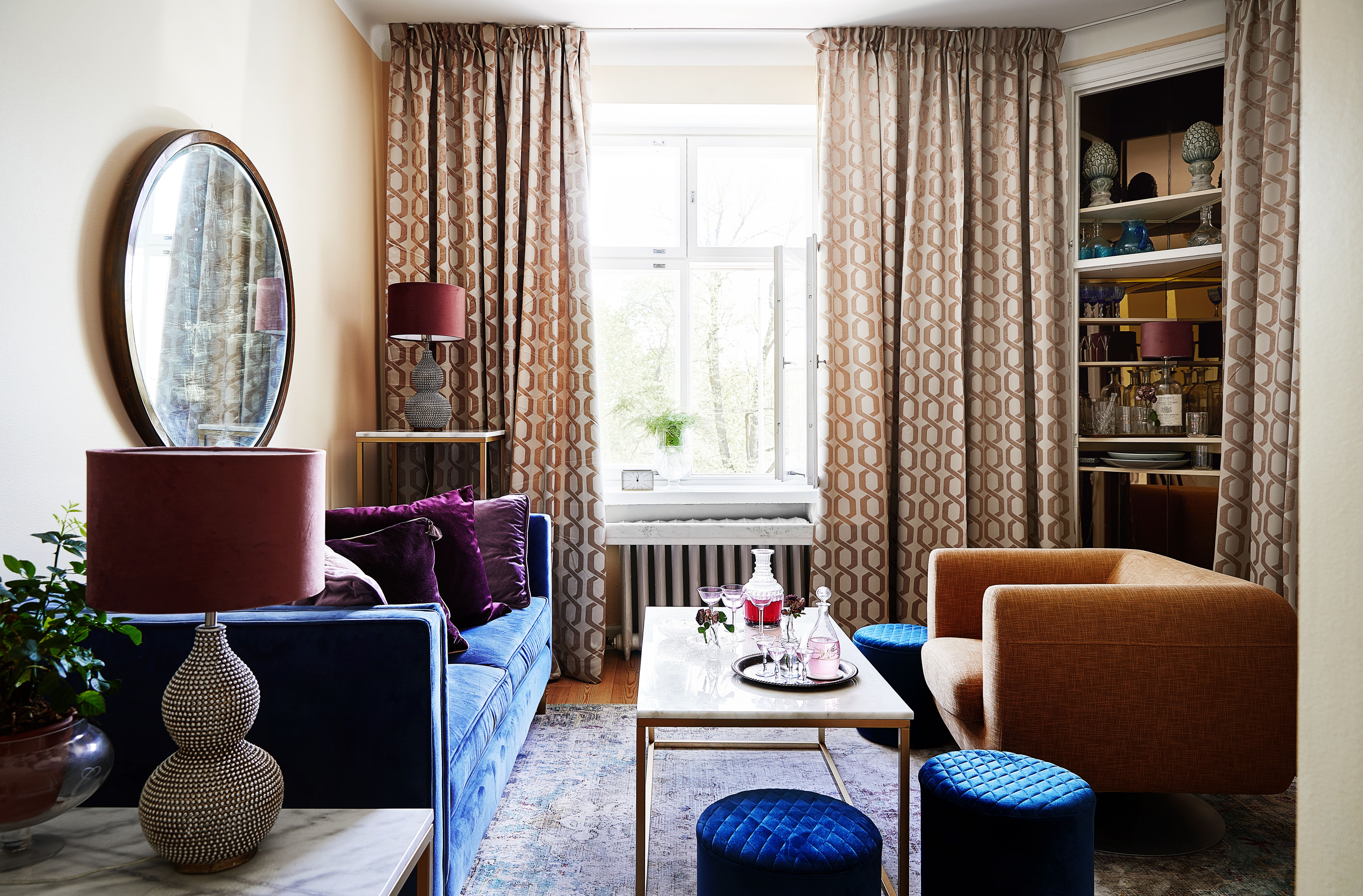 Olohuone on naisellinen ja pehmeä samettisine sohvineen ja tyynyröykkiöineen. Muhkeat pimentävät verhot kiertävät olohuoneen kattoa melkein koko huoneen ympäri. Verhoja voi siirtää seinältä toiselle ja niillä voi rajata makuuhuoneen omaksi tilakseen tai piilottaa tv:n verhoseinämän taakse. Olin onnekas ja löysin taitavan tekijän verhokiskoille, ne toteutti Anja Pesola. Samanlainen kisko kiertää myös sisäparveketta ja Joonan huonetta. Päiväbaarin toteutin vanhaan kylmäkaappiin, joka oli huoneen kulmassa tyhjillään. Poistin siitä oven ja täytin hyllyt kauniilla lasikarahveilla ja laseilla. Kaapissa ei niinkään säilytetä alkoholia, vaan laseista nautitaan erilaisia ihania terveysjuomia, joita olen löytänyt Rasvaamon valikoimiin.