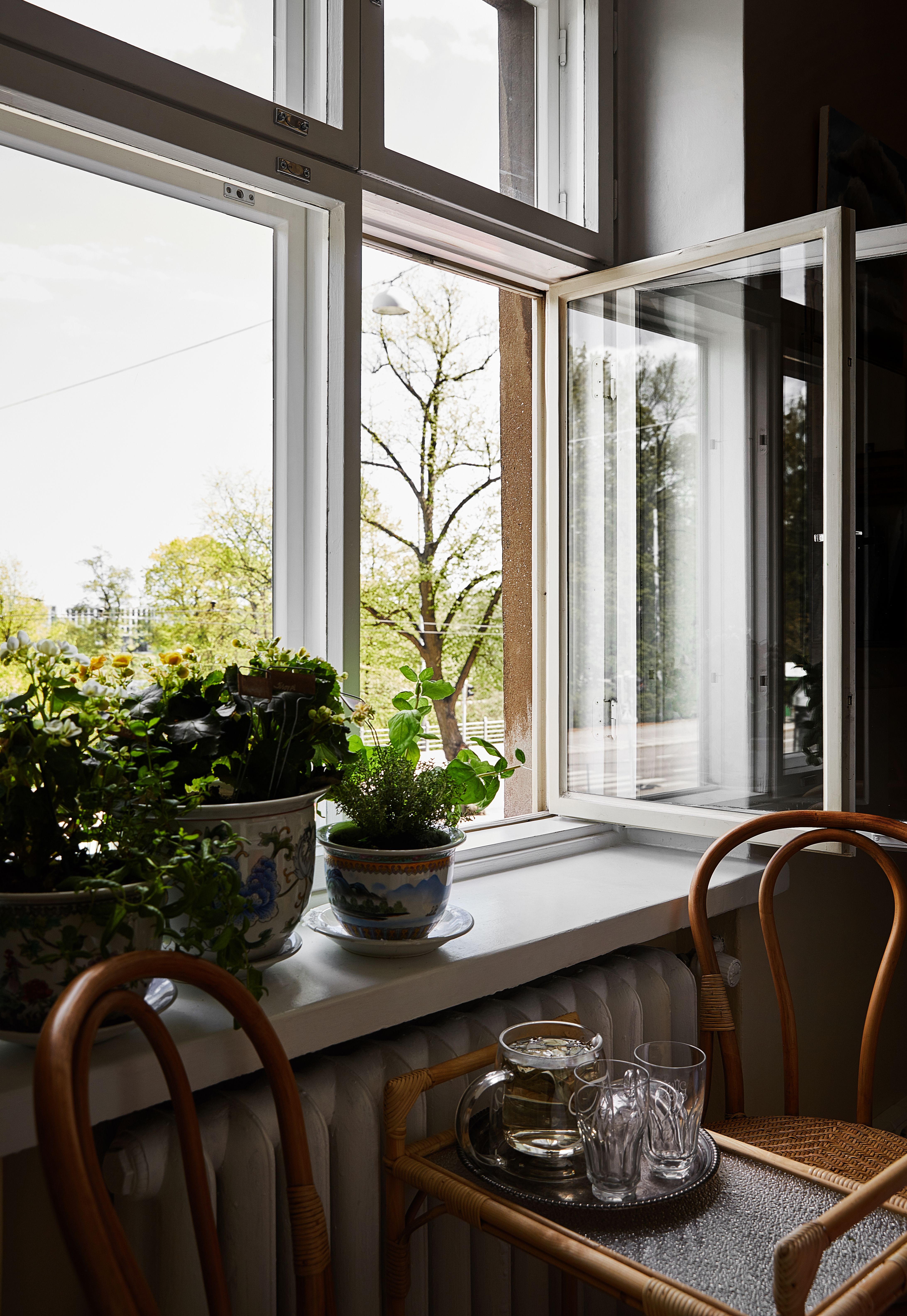 Teetin ruokatilaan valtavan pöydän ja sen päätyyn lasiovet, jotka luovat pienen tilan ikkunoiden edustalle. Sinne sisustin sisäparvekkeen, jonka ikkunalaudat täytin yrttiruukuin. Kotimme sisälle syntyi kuin pieni parveke, jonka ikkunat aukeavat suoraan Mannerheimintielle. Sisäparvekkeella istuessa raitiovaunut kolisevat allamme ja Töölönlahden tuuli puhaltaa asuntoomme. Sisäparvekkeen kautta myös kuljetaan poikani makuutilaan. Messinkiraamiset ikkunat toteutti Lasitehdas.