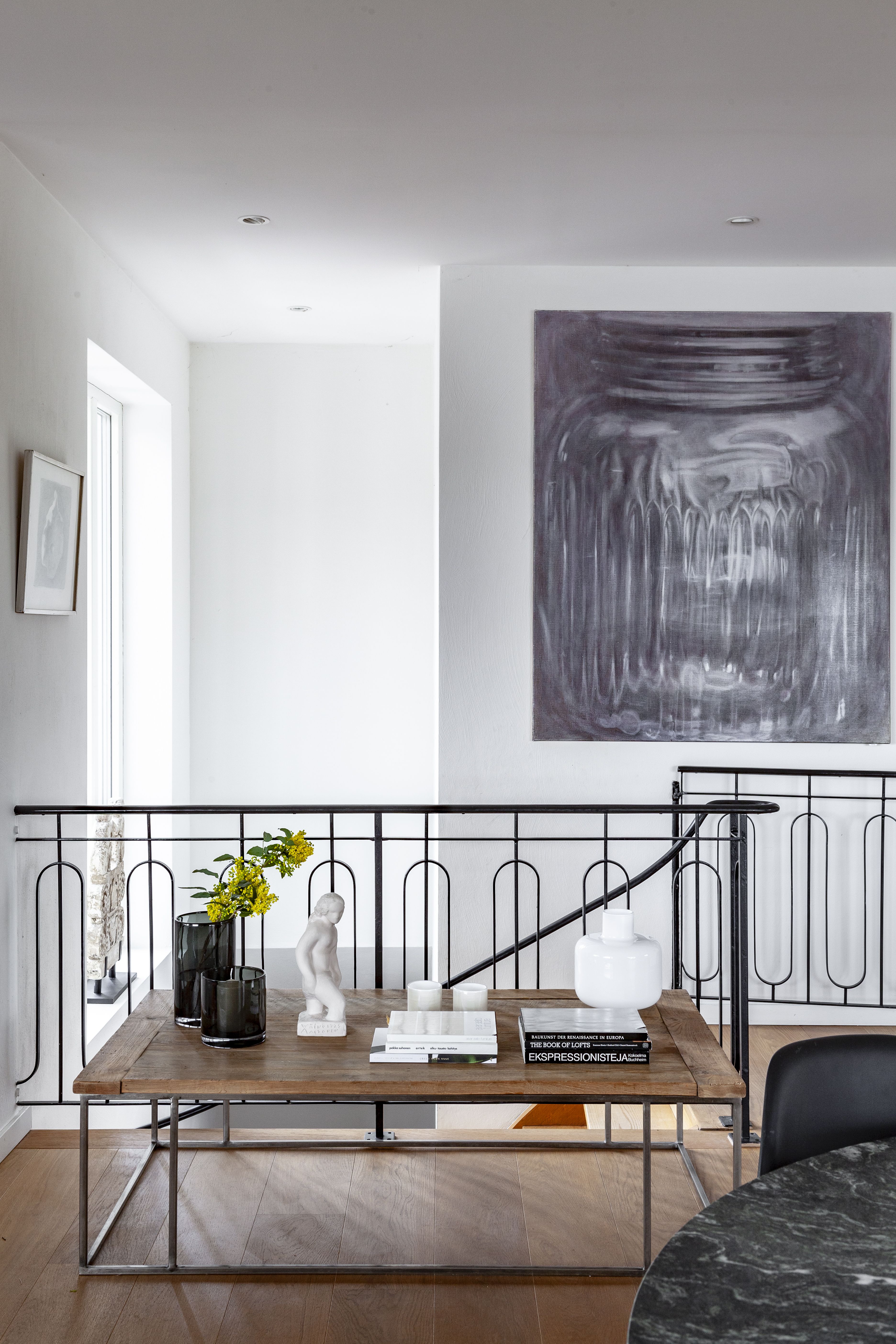 Talon alkuperäinen, hienosti työstetty 50-luvun portaikko oli toinen asia, johon talossa tykästyimme. Suuresta yläkerran korkuisesta ikkunasta laskeutuu portaikkoon ja alakertaan hieno valo. Ihastuimme kauniisti entisöityyn portaikkoon ja sen siroon mustaan metallikaiteeseen sekä entisöityihin, alkuperäisiin välioviin. Nämä ovat näennäisesti pieniä, mutta hyvin tärkeitä yksityiskohtia, sillä ne johdattavat tulijan talon tunnelmaan ja kiinnittävät sen arkkitehtuurin omaan aikakauteensa.