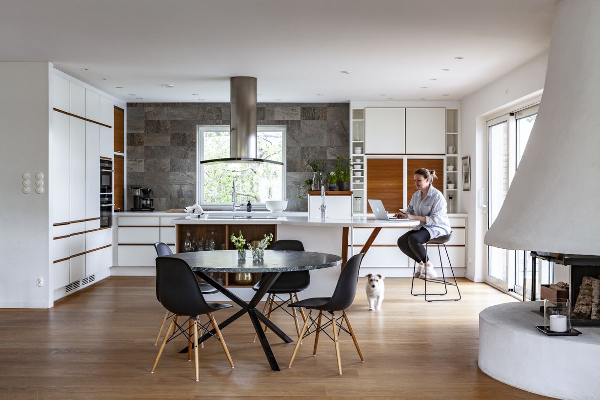 Koti: 200-neliöinen omakotitalo meren rannalla Tukholman Stocksundissa. Talo on rakennettu 1950-luvulla ja remontoitu 90-luvulla. Pariskunta muutti juuri ennen jutun ilmestymistä takaisin Suomeen.