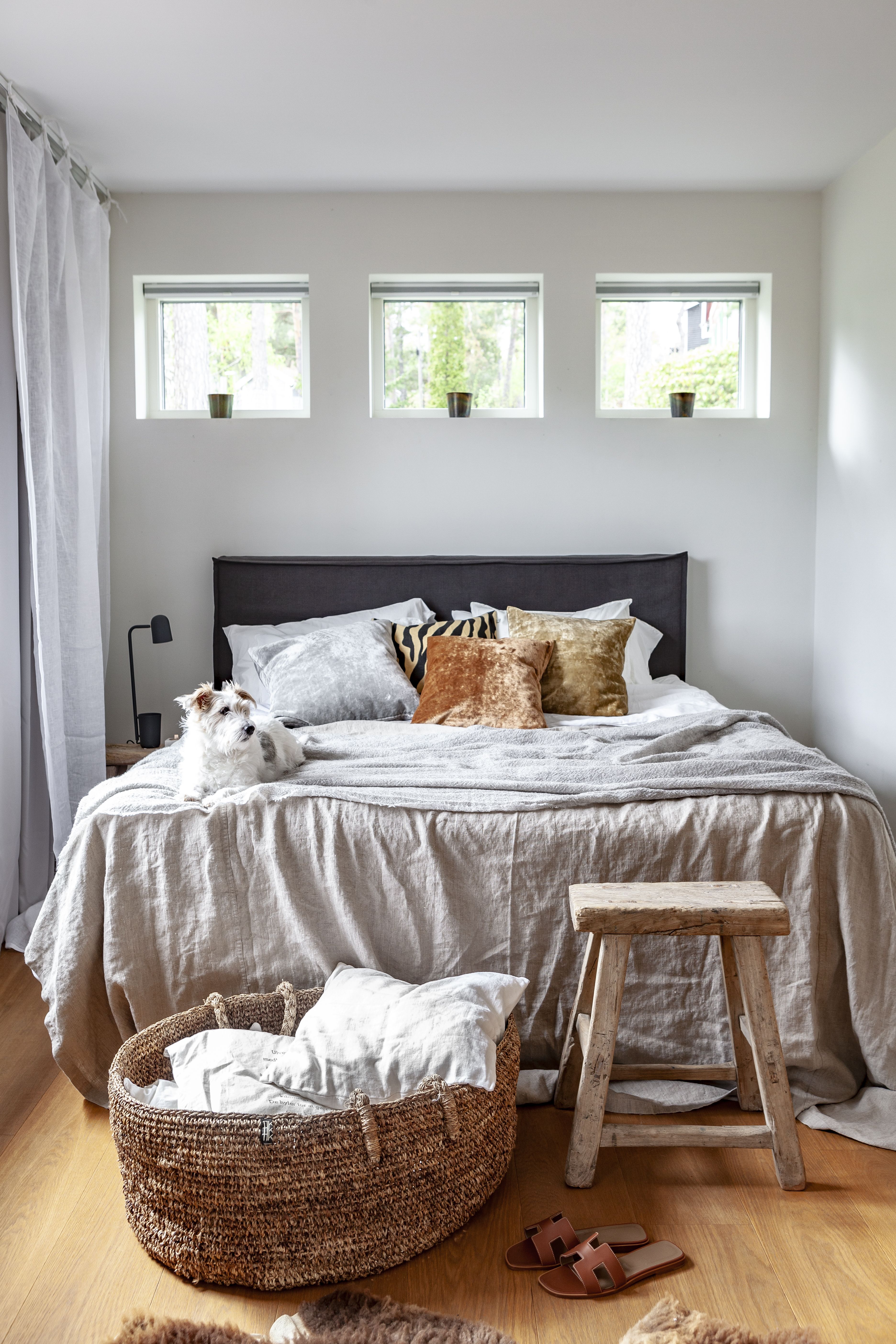 Makuuhuoneemme rauhallinen ja luonnonläheinen tunnelma on meille hyvin tärkeää arjen kiireestä palautumisessa. Se on rauhoittumispaikka, jonka pitää esteettisestikin olla selkeä. En halunnut sisustukseen teräviä muotoja tai kylmiä materiaaleja. Vuokra-asunnossa emme voineet ryhtyä maalaamaan seiniä tai vaihtamaan lattiamateriaalia, joten käytin halutun tunnelman saavuttamiseen tekstiilejä.