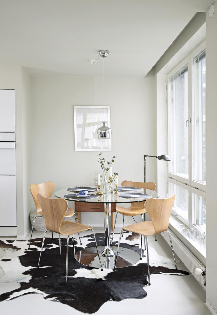 Haasteenamme oli kahden erittäin erilaisen sisustajan tyylin ja tavaroiden sovittaminen rajallisiin neliöihin. Varastoimme muutamia huonekaluja ja teimme tilaa yhteiselle tyylille. Gervasonin sohvani sopi puolison designklassikoiden keskelle helposti, ja muutama rakkain vintagehuonekaluni löysi helposti paikkansa. Palapelin ratkaisi Beni Ourain -matto, joka oli ensimmäinen yhteiseen kotiin hankkimamme tavara. Muhkea villamatto tuo betonilattialle lämpöä ja keräsi olohuoneen huonekalut keskustelemaan keskenään. Luovuimme televisiosta, ja löysimme Skannosta olohuoneeseen linjakkaan, ranskalaisen Ligne Roset’n työpöydän ja sen kumppaniksi Hans J. Wegnerin klassisen Wishbone-tuolin.