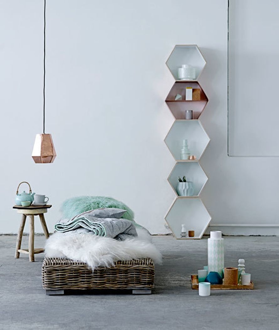 Ihan vähän minttua ja vielä vähemmän vaaleanpunaista mutta toimii! Haaleat sävyt ovat harmonisia ja kerrostettuina luovat myös yllätyksellisyyttä. Sekä kuusikulmiot että päivävuoteet ovat muuten todella in. Kuva: Bloomingville.