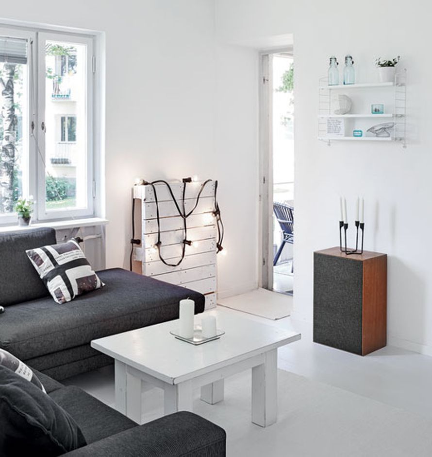 Tässä kodissa kuormalava on maalattu valkoiseksi ja nostettu olohuoneen seinää vasten pystyyn. Päälle on ripustettu "sirkusvalot". Eurolavoja löytää silloin tällöin esimerkiksi roskalavoilta ja ojanpientareilta. Lavoja myy esimerkiksi espoolainen J. Woltter. Valosarjoja saa nykyisin monesta sisustusliikkeestä, esimerkiksi Granitista.
