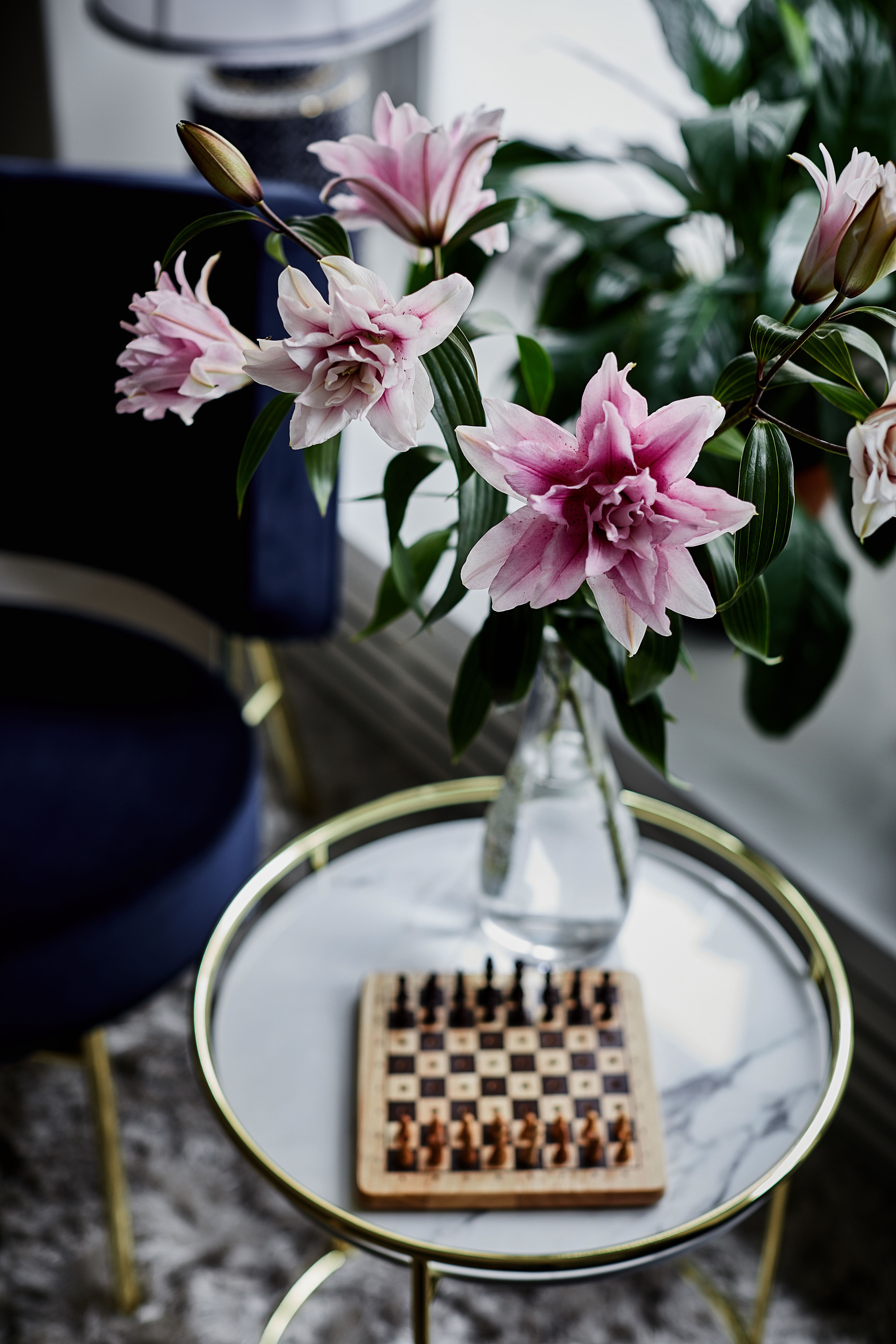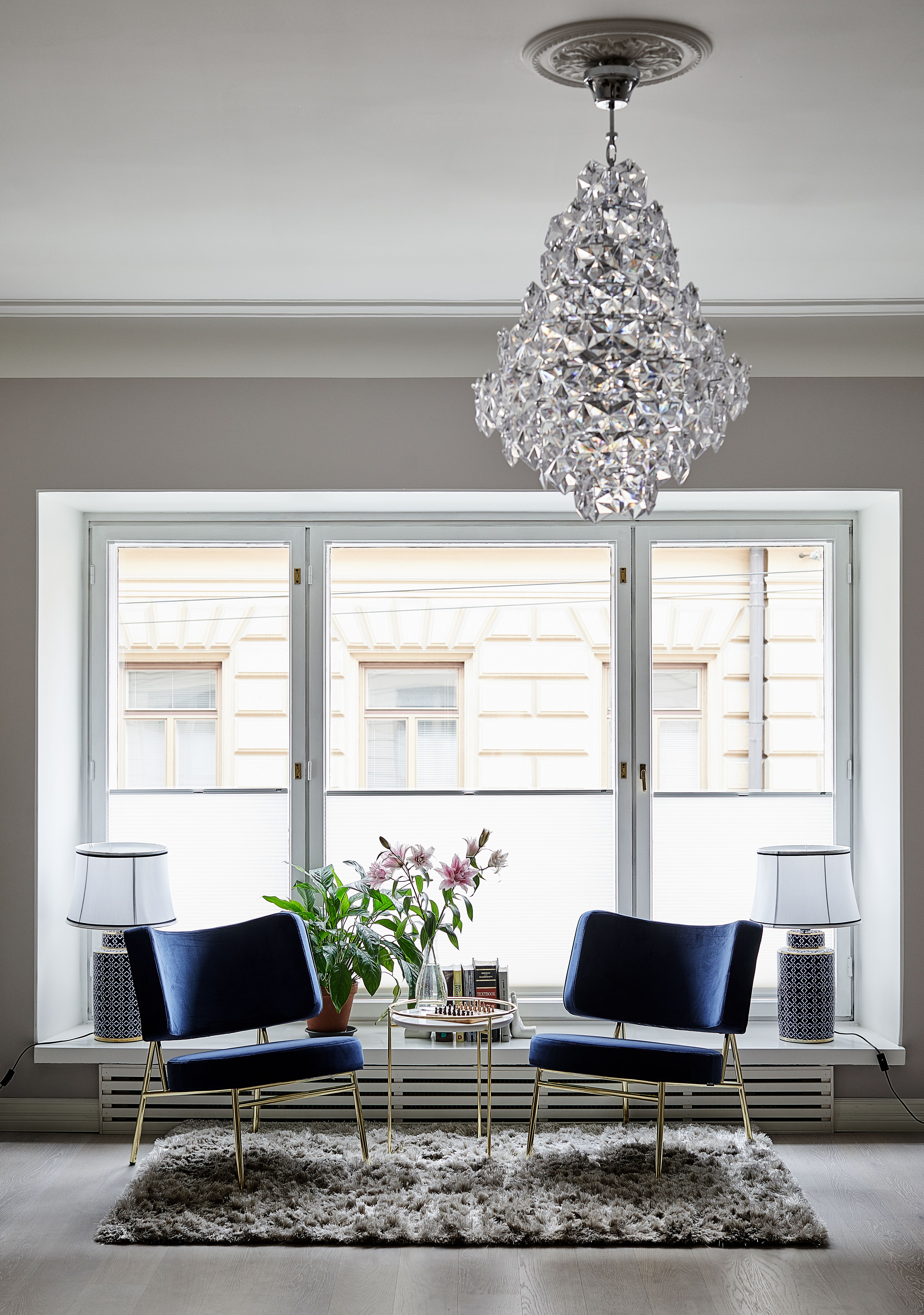 Rapusta astutaan pienen portaikon kautta kotimme eteisaulaan, josta aukeaa näkymä olohuoneen ikkunoihin ja suoraan kaupunkiin. Ihastuimme ensi näkemältä juuri tuohon kohtaan asunnossamme. Ikkunan edessä oli aiemman asukkaan jäljiltä kaksi nojatuolia ja pikkupöytä shakkilautoineen, ja tiesin heti, että haluan toteuttaa samanlaisen oleskelupaikan meillekin. Löysimme kaksi tummansinistä samettiverhoiltua nojatuolia, jotka muodostavat juuri oikeanlaisen tunnelman yhdistettynä pieneen marmoripöytään. Pidämme myös valtavasti näkymästä, joka jatkuu läpi asunnon huoneesta toiseen. Tunnelma on kuin Pariisissa, jossa aikoinaan asuin useamman vuoden ajan.