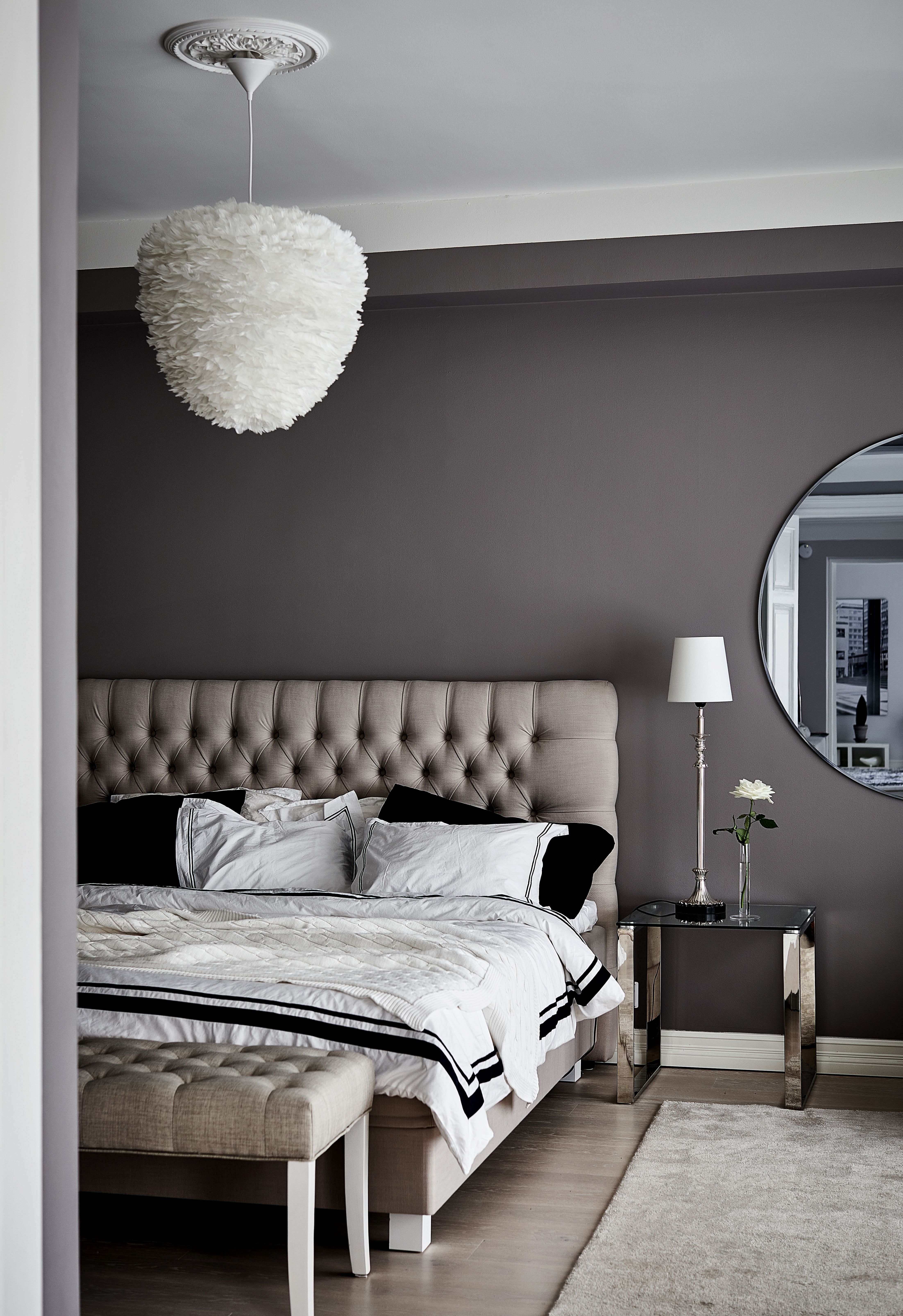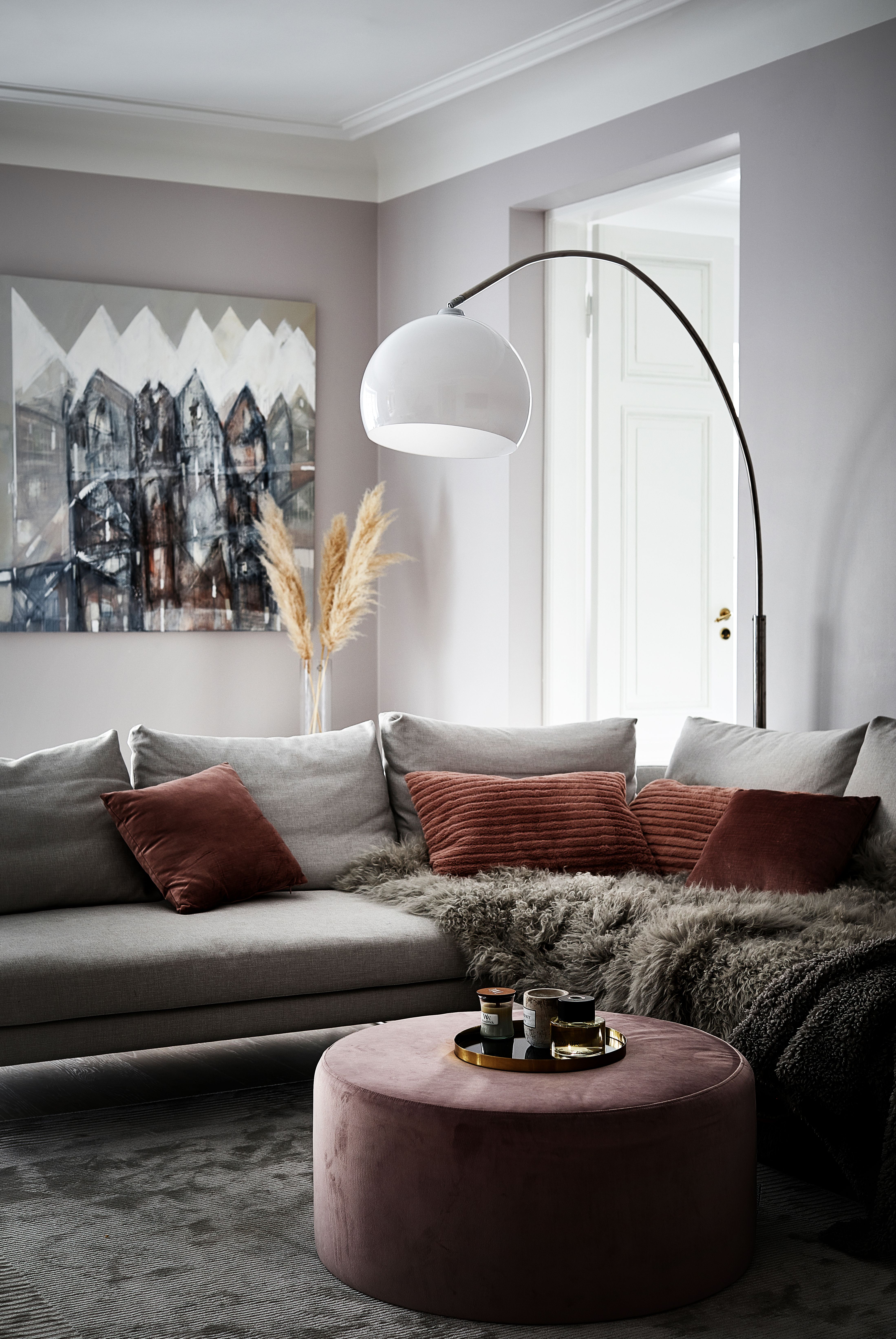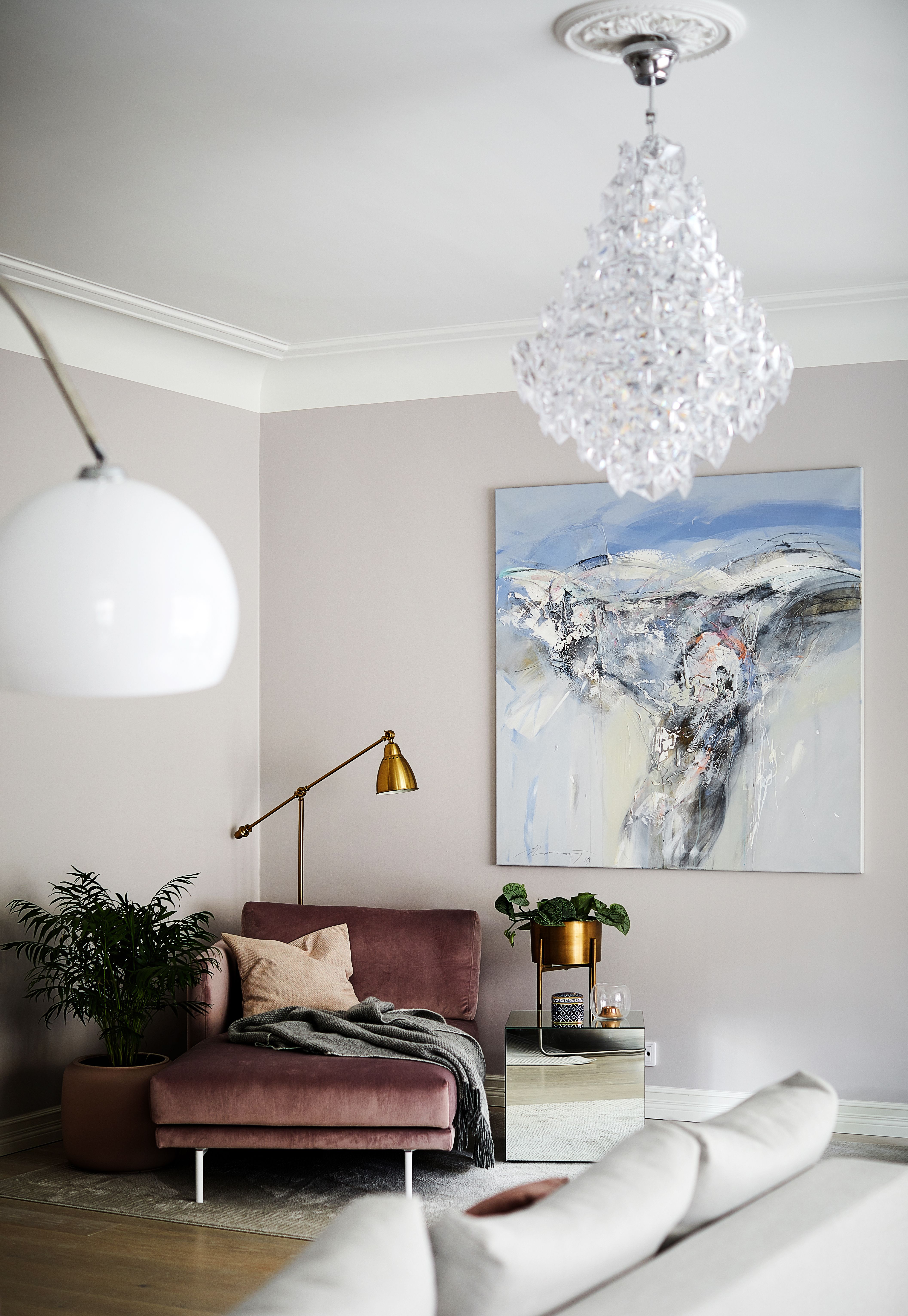 Aiemmissa kodeissamme on aina ollut valkoiset seinät, mutta täällä halusimme kokeilla jotain muuta. Olimme sävyjen valinnassa hieman epävarmoja, joten kyselimme neuvoa Tikkurilalta. Saimme ehdotuksen Pro Grey -kartan maalisävyistä, jotka tummenevat huoneesta toiseen. Vaalein tila on vierashuone, olohuone on asteen tummempi, keittiöön sävy voimistuu taas hieman ja päätyyn sijoittuva makuuhuone on jo tummanharmaa. Vaikutelma on kiinnostava, kun kaikista huoneista näkee seuraaviin ja sävyt vaihtuvat lähes huomaamatta. Harmaan seurana kodissamme on vaaleanpunaisen sävyjä ja messinkisiä yksityiskohtia.