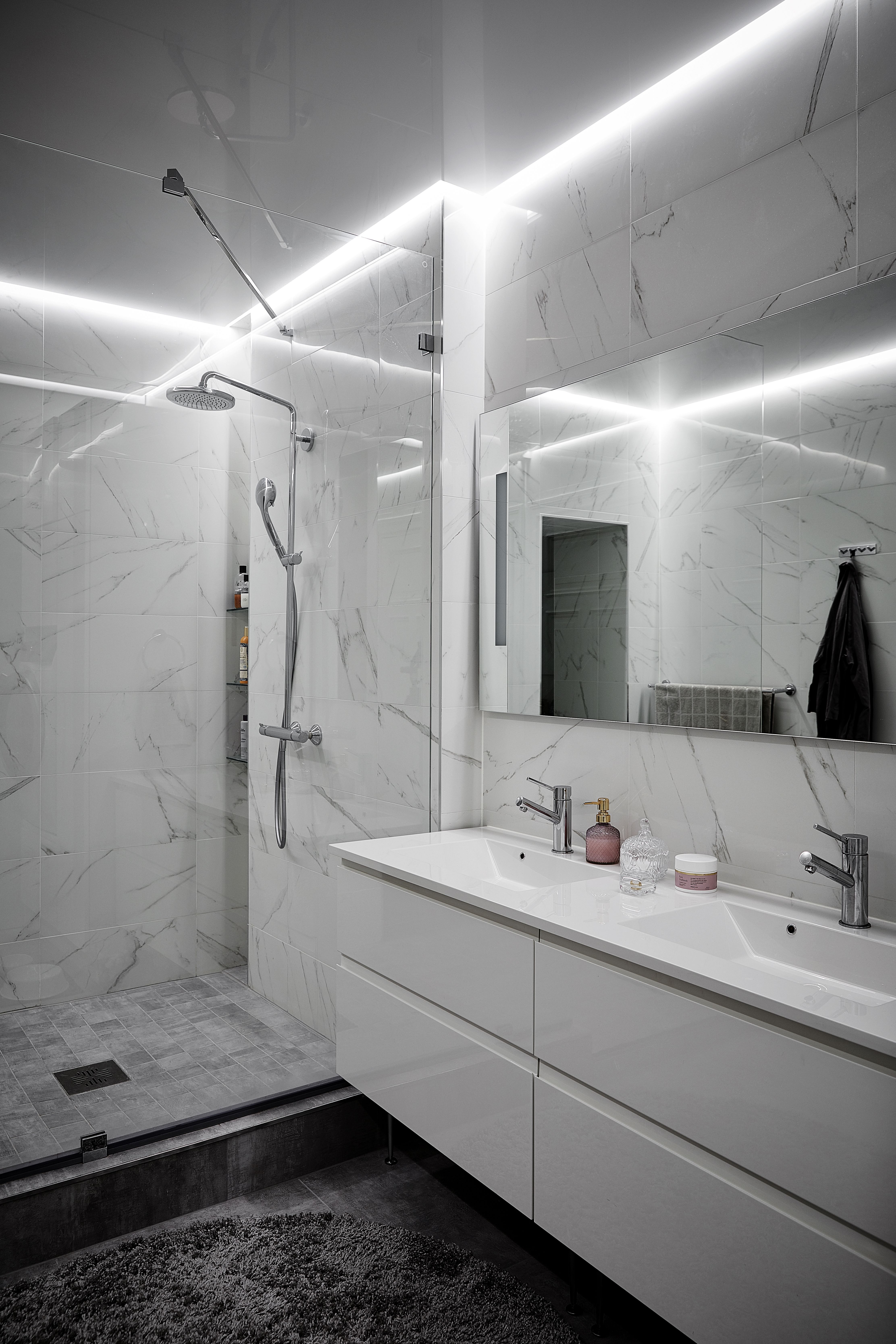 Kotonamme on rauhallinen tunnelma, jollaista tavoittelimmekin. Kiireisen arjen vastapainona kodin pitää olla paikka, jossa ajatukset voi nollata ja jossa kaikki on kunnossa. Pidän etenkin entisen keittiön paikalle saneeratusta kylpyhuoneesta ja sen katosta. Näin samalla tekniikalla toteutetun pingotetun kangaskaton ystäviemme kotona ja halusin itsekin kokeilla sitä. Rakastamme luonnonmateriaaleja, ja lattiaan valittiin sekä puuta että kiveä. Eteiseen asensimme marmorilaattalattian, ja sama laatta toistuu keittiön välitilassa ja uudessa kylpyhuoneessa. Muualle kotiin laitettiin Novafloorin yksisauvainen öljyvahattu ja harjattu tammiparketti, jonka Lumi-käsittely tekee siitä hieman vaaleamman. Kotimme tekstiileissä suosimme puuvillaa, pellavaa ja samettia.