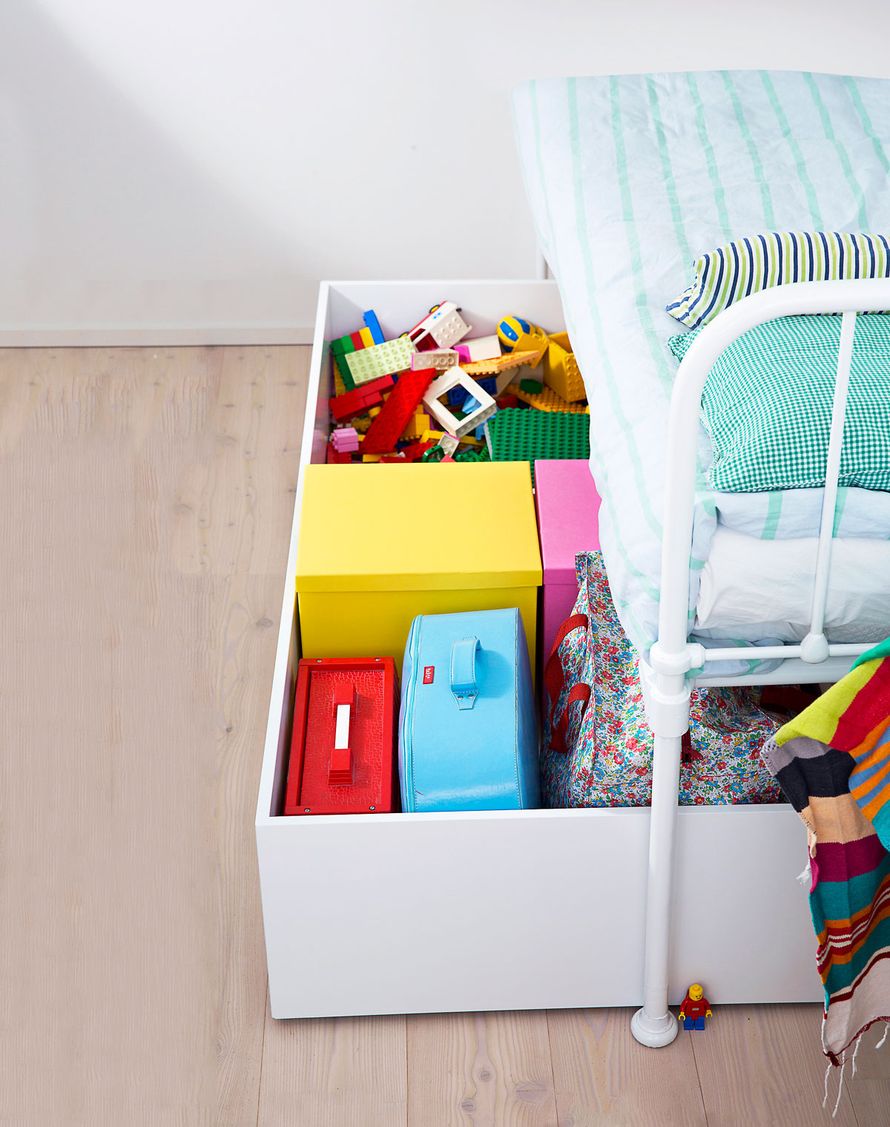 Mihin kaikki lelut sitten siivotaan? Sängyn alle mahtuu yllättävän paljon tavaraa. Valmiita laatikoita voi löytää kierrätyskeskuksista ja Ikeasta, mutta sopivimman saa teettämällä mittojen mukaan. Itse teetin sängynaluslaatikon ja laitoin alle kumipyörät, niin lelut on helppo vetää esiin – ja siivota taas laatikkoon.