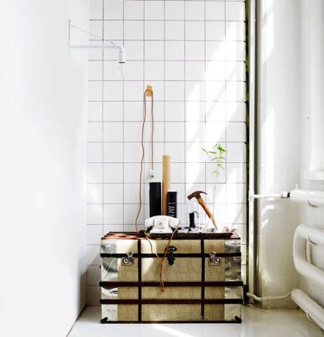 Helpointa ja halvinta on sisustaa tavallislla arjen esineillä. Mikä estää nostamasta vasaraa koristeeksi? Tässä idea, jonka voit luoda arjen esineistä: Valkoinen putkivalaisin on Perobasta. Vanha Ericsson-lankapuhelin ja lasisuppilo, Toisto. Lasikupu, Olkkari. Sisällä oleva patapesin, Proloque. Vanha matka-arkku, Moko. Vasara ja paperirullia löytynee joka kodista. Kuvan sisustus: Anna-Kaisa Melvas.