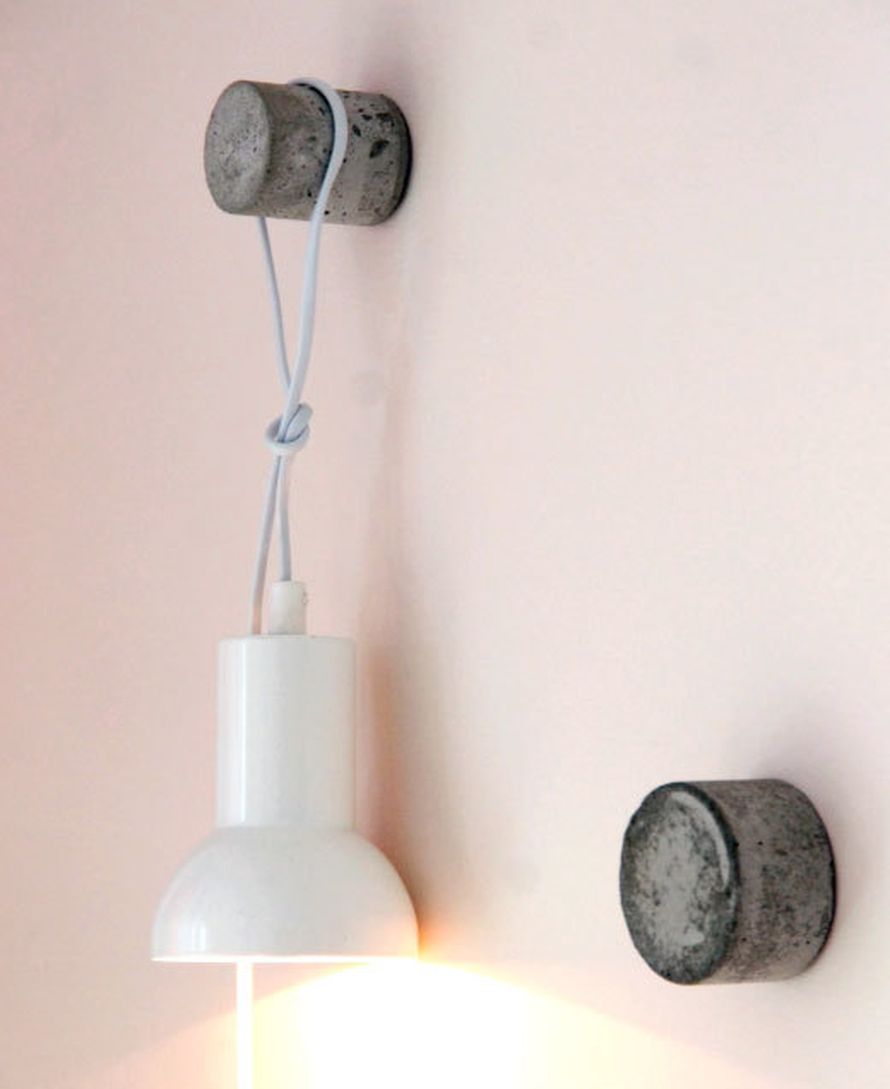 Betoniset seinälampun pidikkeet valettiin märkätilatasoitteesta. Muottina käytettiin leivinjauhe- ja vitamiinipurkkeja. Massa sekoitettiin pussin ohjeen mukaan ja seos kaadettiin muottiin. Suurehkon ruuvin ympärille kieputettiin tiukasti rautalankaa, johon jätettiin lenkkejä, jotta ruuvi ei lähde massan kovettumisen jälkeen pyörimään. Parin päivän kuivumisen jälkeen purkki kuorittiin pois valmiin tuotteen ympäriltä. Nämä pyöreät kaverit sopivat niin eteiseen takkeja pitelemään kuin keittiön tunnelmavalaisimen uudeksi sijoituspaikaksi. Kukka-amppelikin näyttäisi oikein somalta betonitelineestä roikkuessaan.
