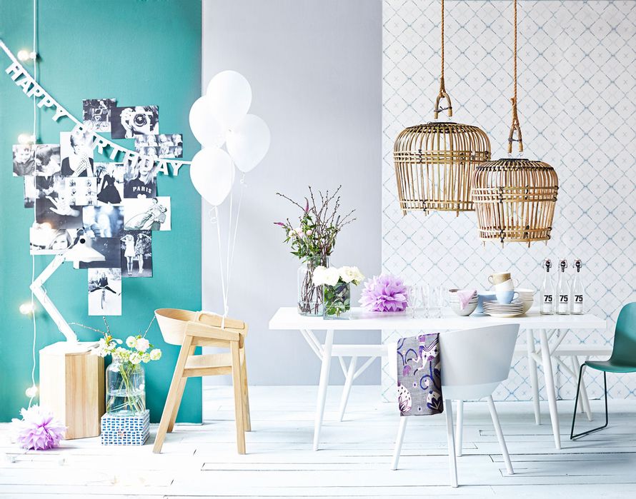 Juhlaan puettu koti jää mieleen. Ajankohtainen värimaailma on suloisen pastellinen yhdistettynä murrettuun vihreään, ja yksi hauskimpia ideoita on päivänsankarista koottu kuvakollaasi.