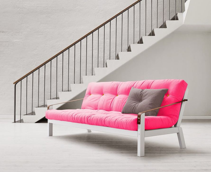 Karupin Poetry-vuodesohvassa ei ole väreissä säästelty: räikeä pinkki kohtaa keltavihreät napit. Kuva: <a href="http://www.karup.eu/" target="_blank">Karup</a>
