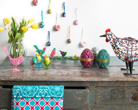 Pääsiäiskoristelua karttaneelle saattaa käydä näiden Oyoy:n puisten Rabbit-Nature pupusten kanssa hassusti: niitä tekee mieli hankkia kerralla kokonainen lauma. Simppeliin skandinaaviseen makuun uppoavat puiset jänöset sopivat pääsiäisen jälkeen vaikkapa lastenhuoneeseen. Kuva: Oyoy Indiskalla on aina ollut näyttäviä ja kirjavia pääsiäiskoristeita, joissa itämaiset herkulliset värit ja kuosit kohtavaat blig-blingin. Kaikessa överiydessään niihin ei voi olla rakastumatta – mitä enempi, sitä parempi! Kuva: Indiska Näinkin helppoa se voi olla: samansävyiset mutta erikuosiset kynttilät riviin – valmis! Broste Copenhagenin tarjoamalla niksillä kodin pääsiäiskoristelu on tyylikästä, muttei liian hillittyä. Keltaisen roiskepöytäliinan pystyt halutessasi tekemään ihan itse, kurkkaa Anna-Kaisan ohjeet tästä. Kuva: Broste Copenhagen