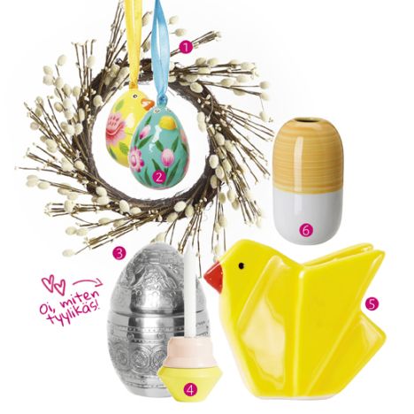 1. Kevät-kranssi, 22e, Pentik. 2. Ripustettavat Happy Egg -koristeet on tehty paperimassasta, 4,90e, Indiska. 3. Näyttävä alumiinen hopeamuna toimii koristeen lisäksi säilytysrasiana, 9,90e, Indiska. 4. Keltaista ja vaaleanpunaista Oyoy:n Tippetop -kynttilänjalassa, 25e, Room21. 5. Posliininen koristetipu, 2,95e, Hemtex. 6. Knaprig -maljakko, 3,99e, Ikea.