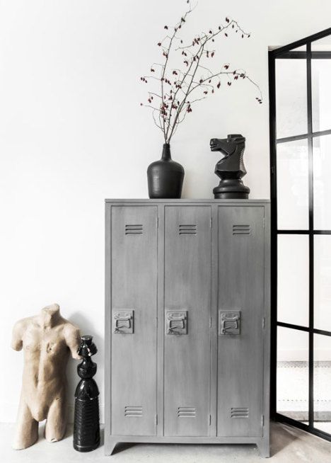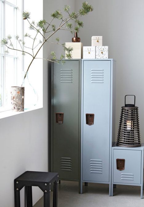 Vanhat metalliset pukukaapit ovat paitsi muodikkaan rosoisia sisustuselementtejä, myös käteviä säilytyskalusteita. Ne mahtuvat moneen pieneen tilaan ja ne voi ottaa helposti muuttaessa mukaan. Käytettyjä kaappeja löytää vanhojen tavaroiden liikkeistä ja nettihuutokaupoista. Myös Roomagesta voi kysellä vanhoja kaappeja. Uusia metallikaappeja myy muun muassa HK Living, katso kuva alla:
