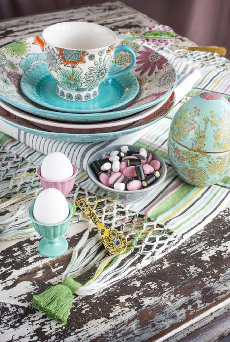 Pääsiäiskattaus syntyy värikkäistä astioista! Indiskan kattauksessa väriä tuovat iso pääsiäismuna, 14,90 e, pastelliset munakupit, 4,90 e ja turkoosit lautaset, alkaen 6,90 e, Indiska.