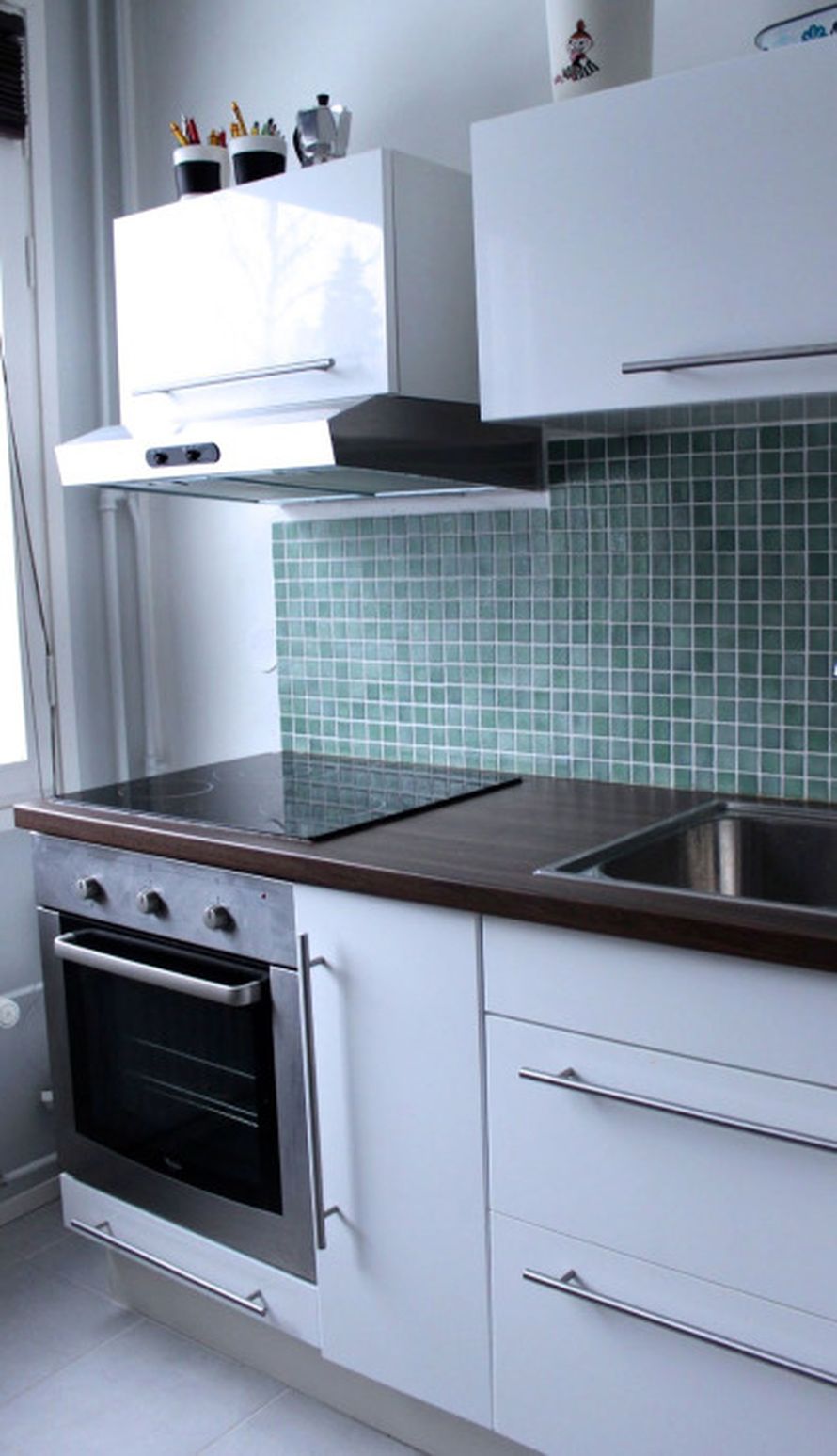 Keittiö oli muuten moderni ja siisti, mutta välitilan vihreät kaakelit tuntuivat tunkkaisilta.