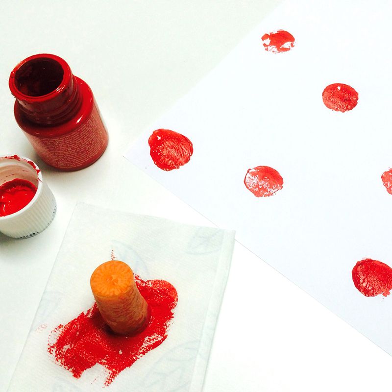 Jos askartelupakistasi ei löydy leimoja, voit mennä jääkaapin kautta. Peruna on kaikkein perinteisin vihannesleimasin, mutta päästä toki muutkin juurekset leikkuulaudalle. Porkkanalla saa sopivan eloisia pallojälkiä, mutta muista tehdä leikkauspinnasta mahdollisimman siisti ja suora. Dippaa porkkana maaliin ja töpäytä paperille. Tämä on todella helppoa ja nopeaa hommaa - ja leimasimen toisesta päästä voi hommien päätteeksi vaikka haukata.