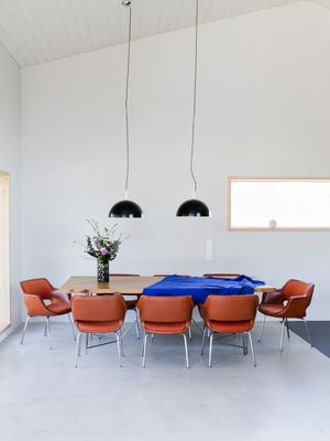 Sisusta Ele Lepikin kodin olohuone sisustettiin taiteilija Marjatta Tapiolan oranssisävyisen teoksen ehdoilla