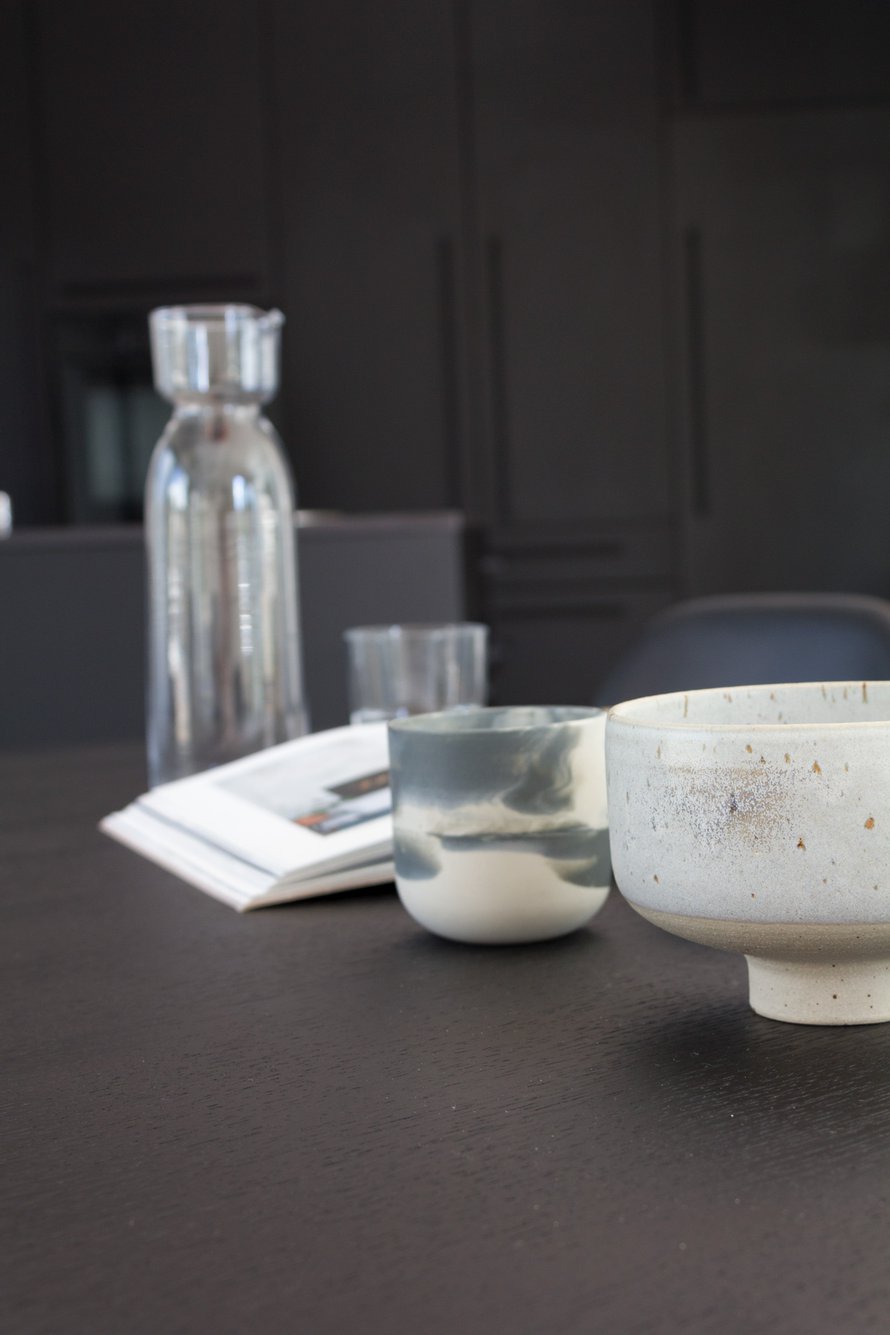 Ruokailutilaan hankiittiin uusi musta pöytä, jolloin ilmeestä tuli tietysti mustavalkoisempi kuin vanhalla korkkipöydällä. Lundia Fuuga-kaapiston päällä meillä on aina kuitenkin tavaraa, jotka tuovat sävyjä kotiin, hiekanväristä keramiikkaa, välillä messinkisiä kynttilänjalkoja ja tietysti vihreää maljakoissa. Keittiö-ruokailutila-akselilla värit ovat tosiaan musta, harmaa ja valkoinen, mutta silti en itse koe sitä niin :D