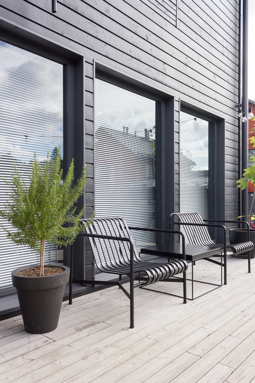 Kovasti odotetut terassituolit saapuivat myös meille lopultakin, samassa kuormassa muiden asuntomessuilta lunastettujen tuotteiden kanssa. Ne ovat Hayn matalat Palissade-tuolit Kaluste Marsalkasta. Vanha Hayn Tray-table siirrettiin varastopaikasta terassille tuolien väliin. Saunan jälkeen olemme ehtineet näillä jo pari kertaa istuakin siideriä juomassa, ihanaa.