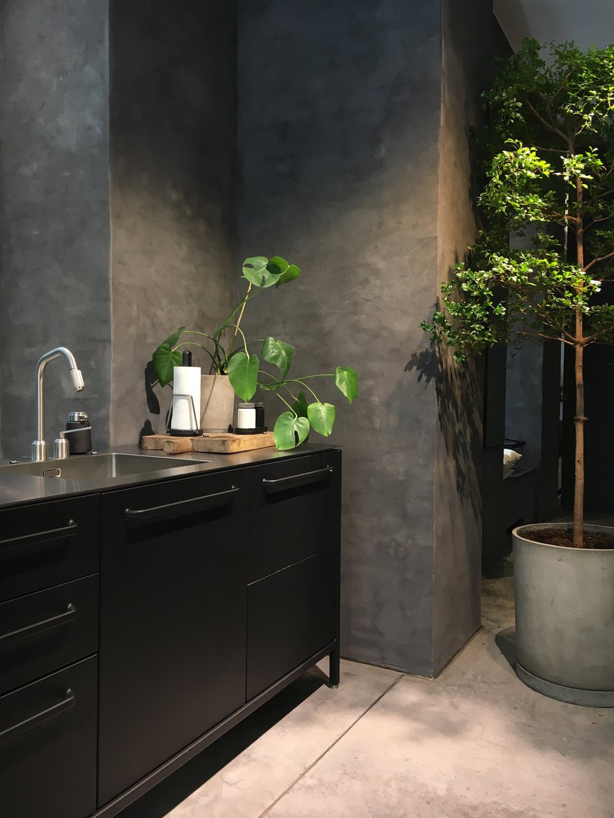 Liiketila itsessään oli jo hieno, betonilattia ja betonipinnoitteella rouheaksi tehdyt seinät. Isot trendikkäät viherkasvit tummanharmaata seinää vasten näyttivät mielettömän upeilta.