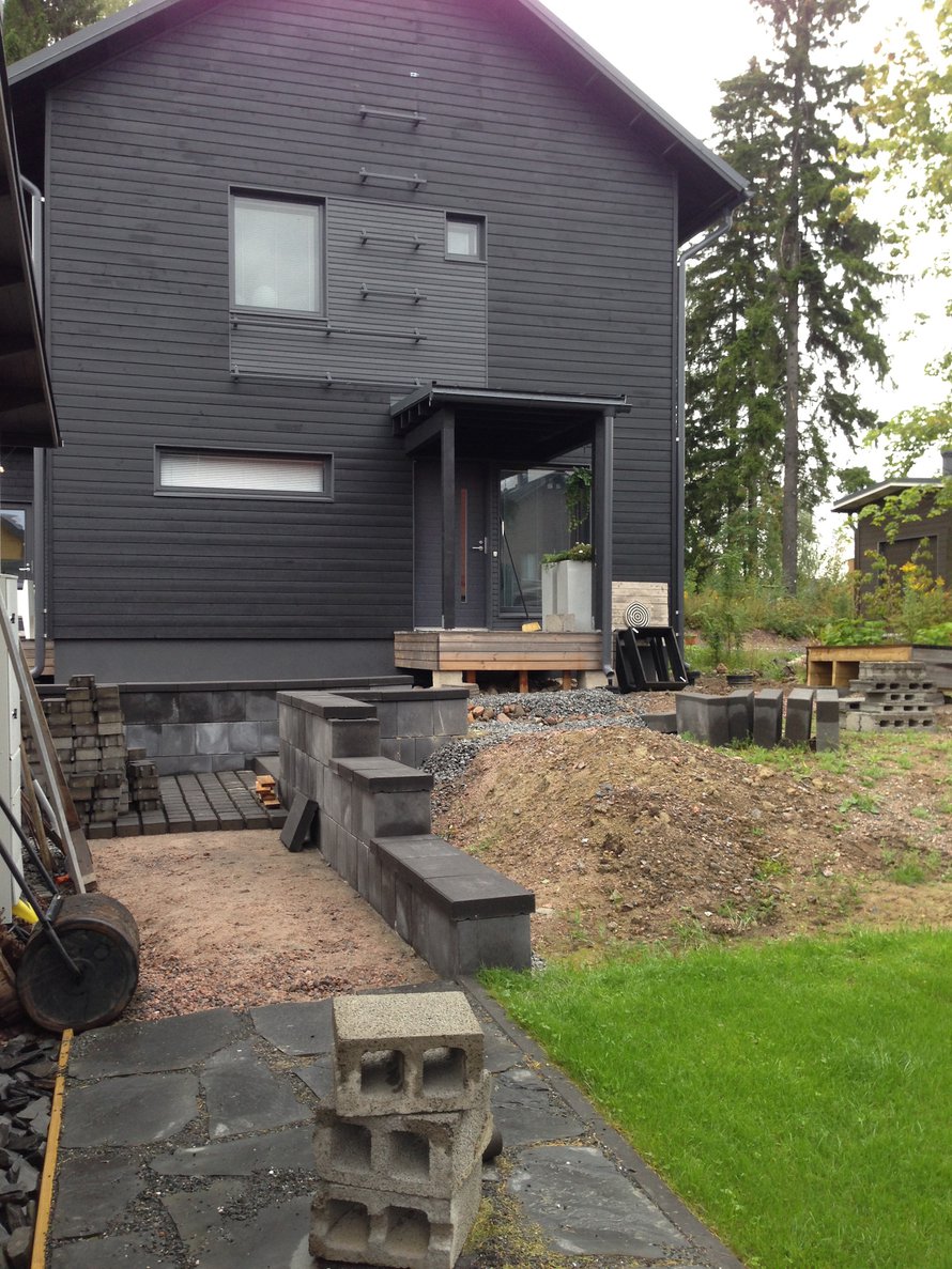 Meillähän on rinnetontti, siksi muurit, jotta saadaan nurmikko-osuus suoremmaksi ja ilme tasaisemmaksi. Muurit loivenevat toiseen päähän, koska nurmikko on tarkoitus laittaa loivaksi. Rakennusluvassa on portaat pääovelle päin, lisäksi ideoimme pienemmät portaat kulkuväylältä pihalle ja terassille, emme halunneet blokata kulkua siinä kohtaa muurilla. Pääovelle vievien portaiden perään upotetaan muutama porraskivi nurmikkoon.