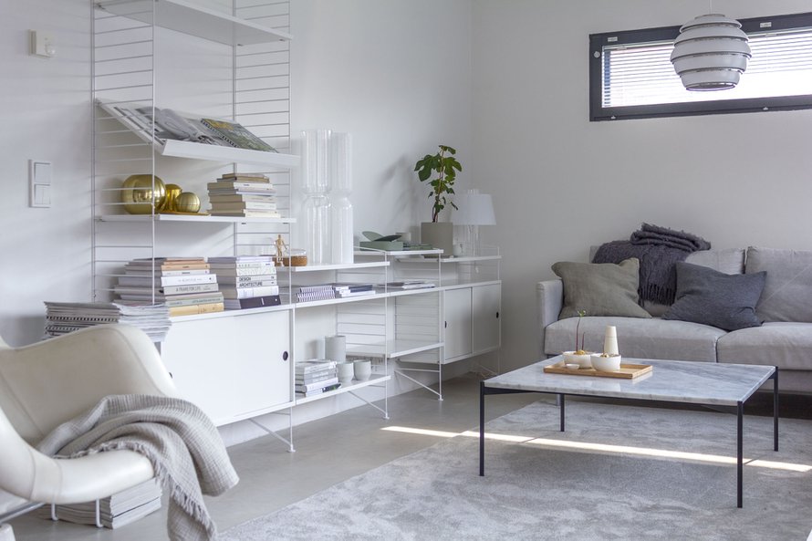 Rakennusvaiheessa oli jo tiedossa, että olohuoneessa yksi seinä pyhitetään kirjahyllylle. Kipsilevyjen alle asennettiin vanerit, mahdollisuus olisi siis ollut järeämmällekin hyllykölle. Vaikka ruotsalainen String on jo niin monessa blogissa ja kodissa nähty, olen siitä aina tykännyt ja sellaisen olin meillekin määritellyt. Kivan kepeä hylly, jossa hylly itsessään ei huomion kohteena, mutta on helppo ja neutraali katsella. Tuttu ja turvallinen. Pitkään mietin myös vaihtoehtoja, mutta tämä miellytti kuitenkin eniten. Meillähän ei muutenkaan ole mitään rohkeita valintoja, vaan klassisia ja ajattomia, rauhallisia. Teen kotona töitä ja pidän harmonisesta maailmasta, missä on helppo keskittyä työasioihin ja olla ajatuksissaan.