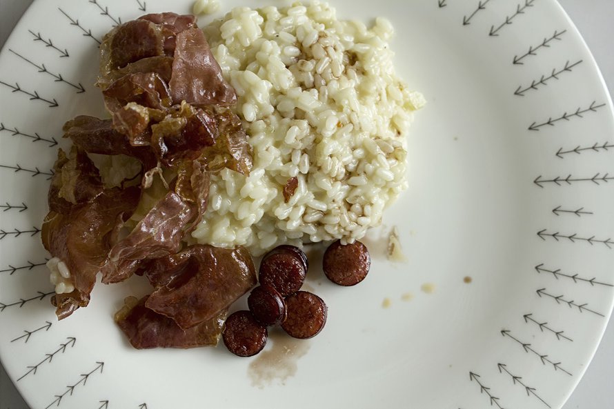 Jos ei suuremmin laitettu joulua, ei niin hössötetä uutta vuottakaan. Kokattiin sentään vähän mukavamman makuista ruokaa, sitä meidän suosikkirisottoa. Kokeiltiin sitruuna-oliiviöljyä ja limeä häivyttämään risoton vähän raskasta olemusta. Kirpeyttä voi lisätä myös laittamalla balsamicoa annoksen päälle. Lisukkeina oli tällä kertaa paistettua parmankinkkua ja choritsoa.